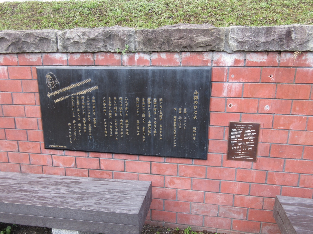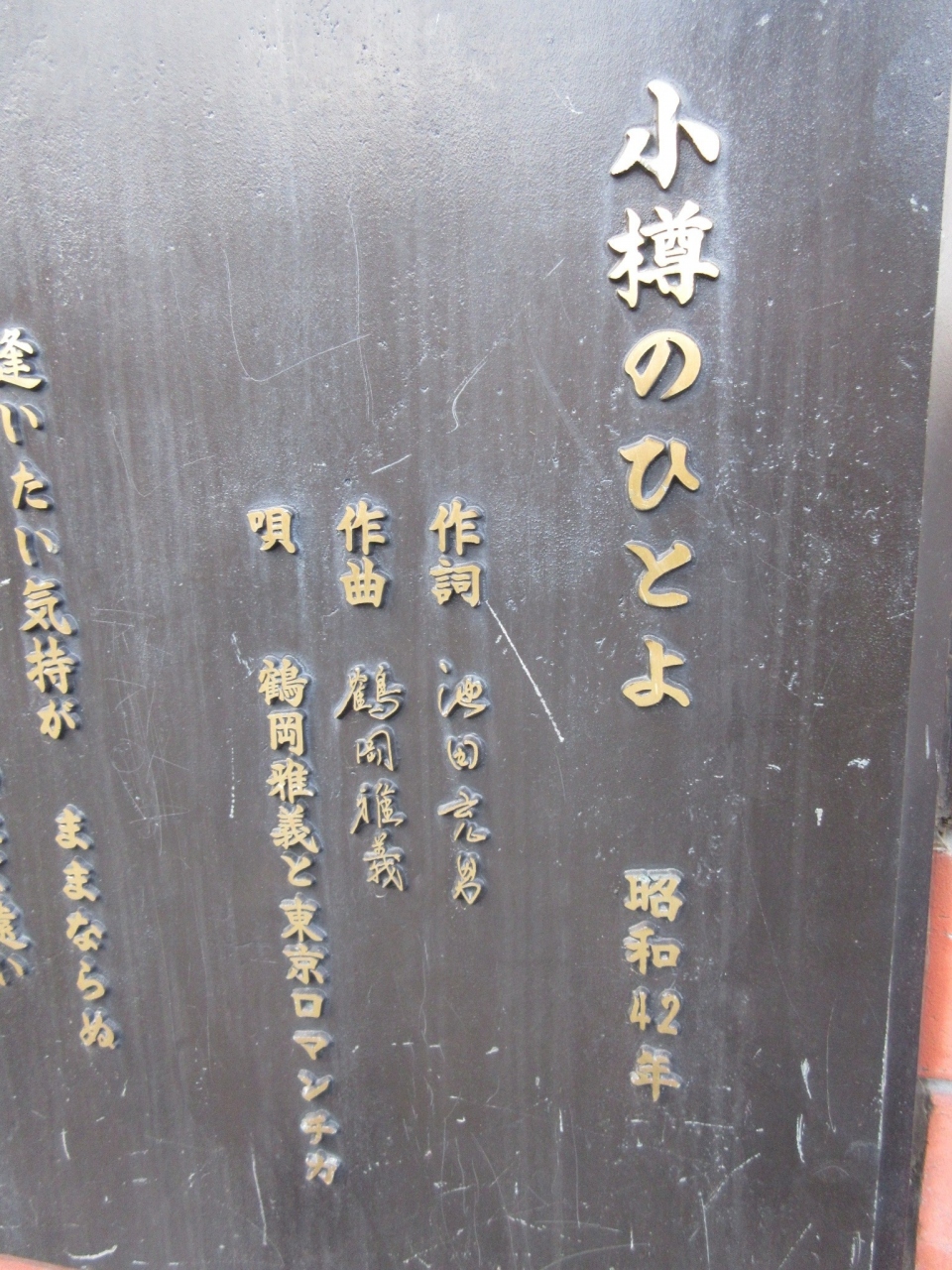 有名観光スポット「小樽運河」沿いの遊歩道の壁に設置されている ご当地ソングの歌詞プレート。