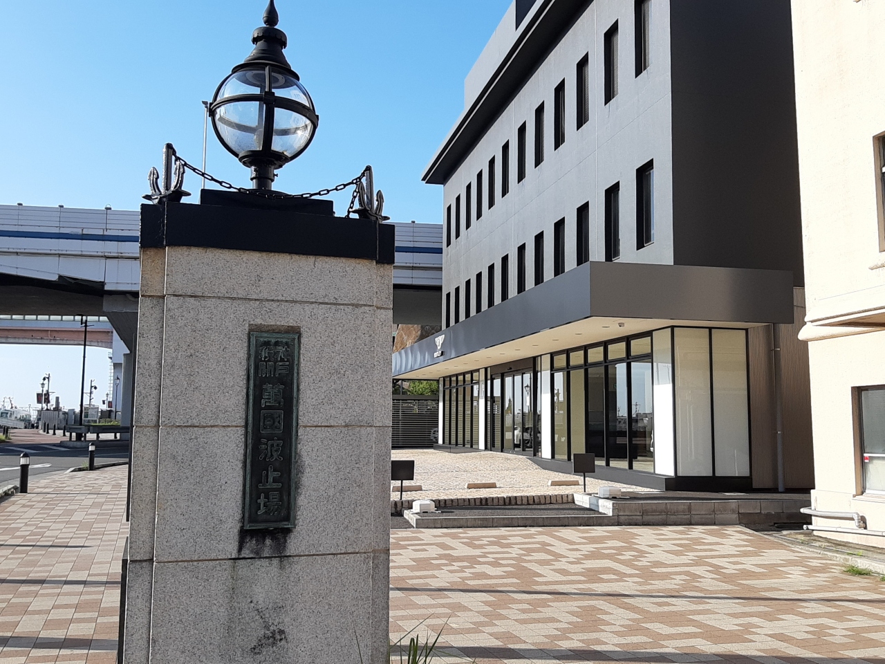 2号線側からだと「萬国波止場」、90度脇だと「メリケン波止場」というプレートが見えます。