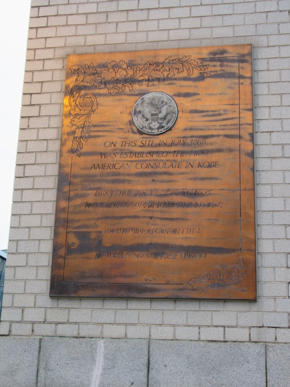 銅製の銘板には「ON THIS SITE IN JULY 1868 WAS ESTABLISHED THE FIRST AMERICAN CONSULATE IN KOBE ☆ 1865年7月(明治元年)この場所において神戸で最初のアメリカ領事館が開設されました ☆ 兵庫県神戸市中央区海岸通1丁目1-1 ☆ 神戸日米協会創立80周年記念(1988年)」と記されていました。