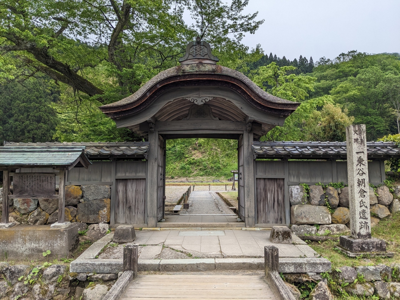 一乗谷遺跡のシンボル的存在。朝倉義景の屋敷があったとされる屋敷跡地の入り口にあります。こちらは朝倉家の菩提寺が江戸時代になってから建立したもので保存状態よく残っておりました。遺跡自体はまだまだ発掘途中のようです。