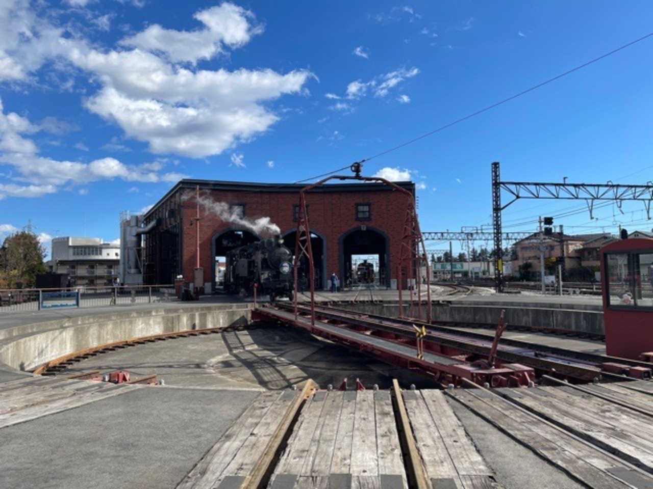 列車が来ていないときも、丸く円になっている転車台が見えて面白かったです。主人が、最近SL列車にはまっているので、栃木の鬼怒川に行った際に見学しました。列車が入ってくる時間帯を事前に調べておくと写真を撮るのに効率がいいと思います