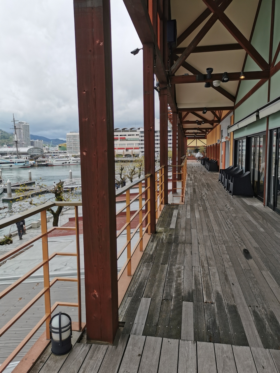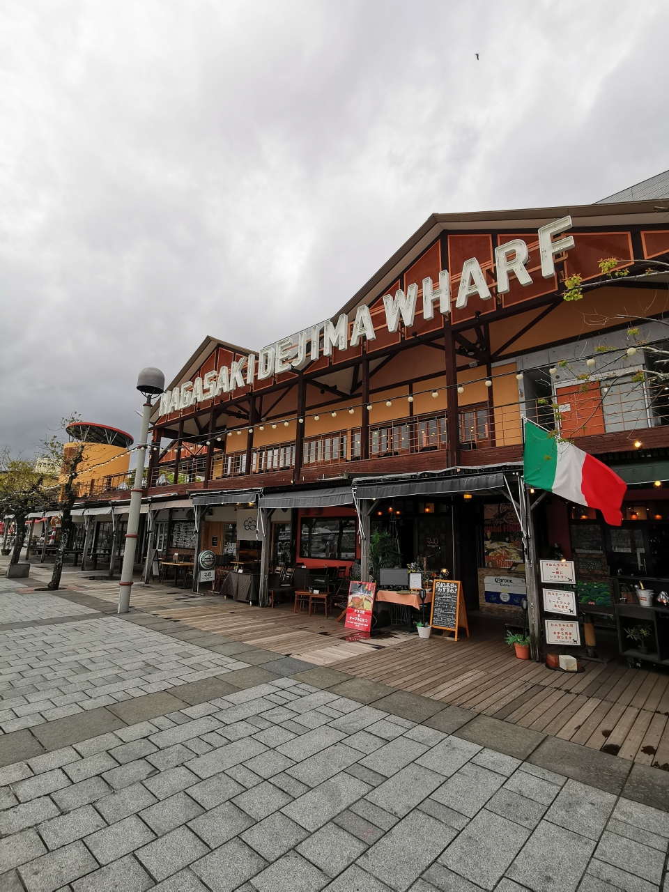 長崎出島ワーフは、長崎港に面したショッピングモールです。2階建てで港に面して横長の建築物です。1Fはオープンなカフェや飲食店がならびます。観光客の皆さんは外にテーブルと椅子を出して、海鮮や中華を食してました。目の前が港ですのでとても眺めよくて綺麗で素敵な場所でした。