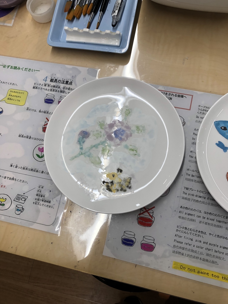 絵付体験をしました。かなりしっかりしたお皿。下絵をボールペンで描き、色つけ。