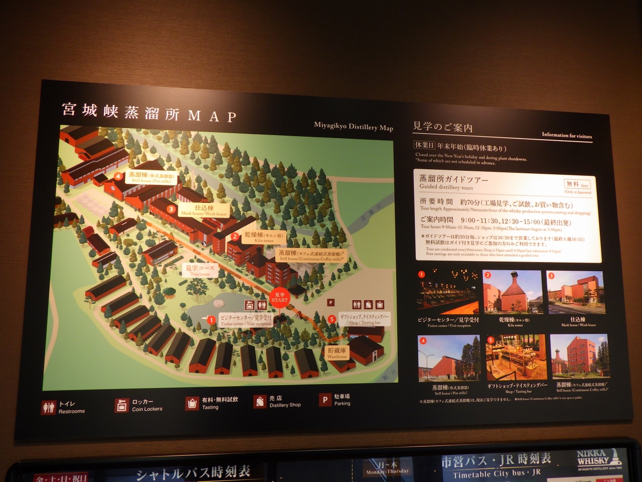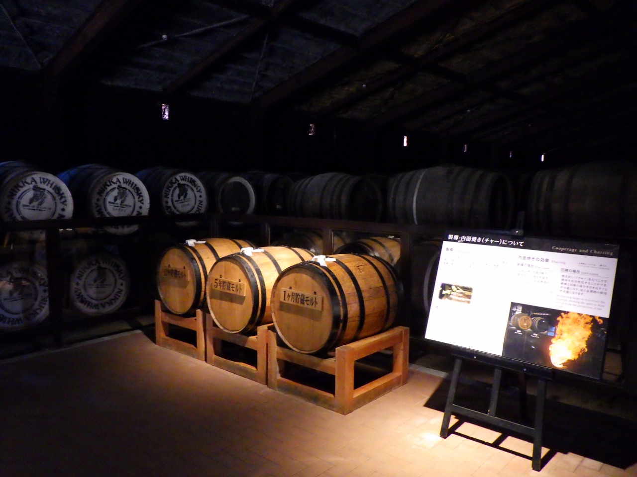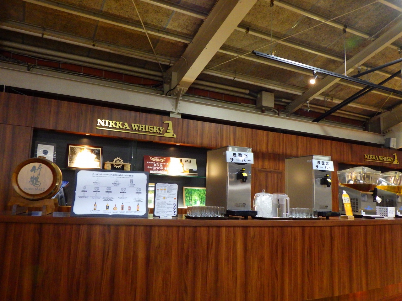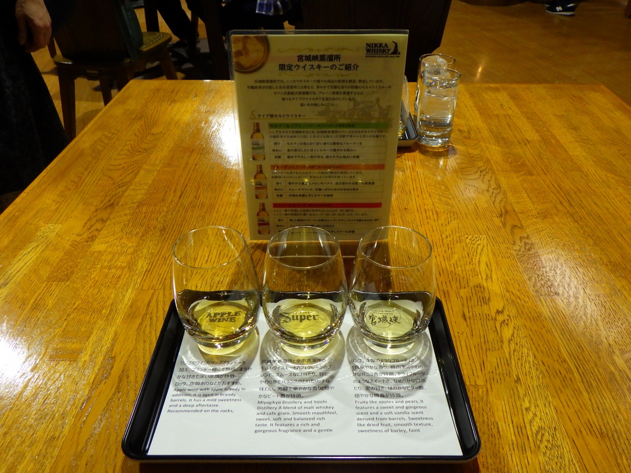 蒸留所見学(ガイドツアー)に参加しました(無料)。ウイスキーの製造方法やニッカの歴史を案内してくれます。ビジターセンターで映像を見て、乾燥棟、仕込棟、蒸留棟、貯蔵庫を見学、最後に無料試飲3杯。宮城峡、スーパーニッカ、アップルワイン。氷、炭酸水、水で割って飲みます。ウマイ!