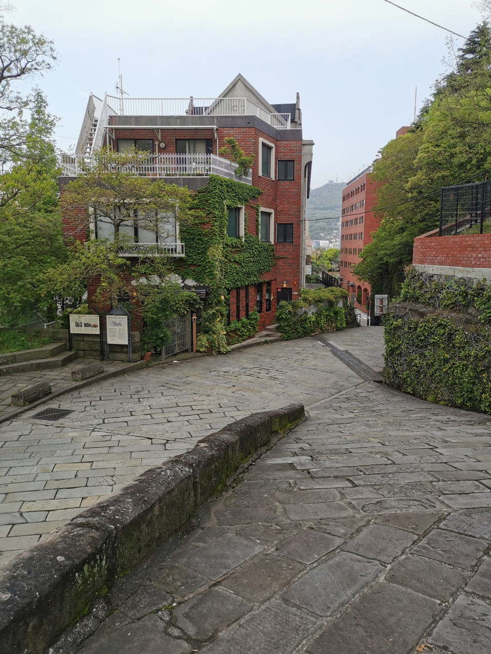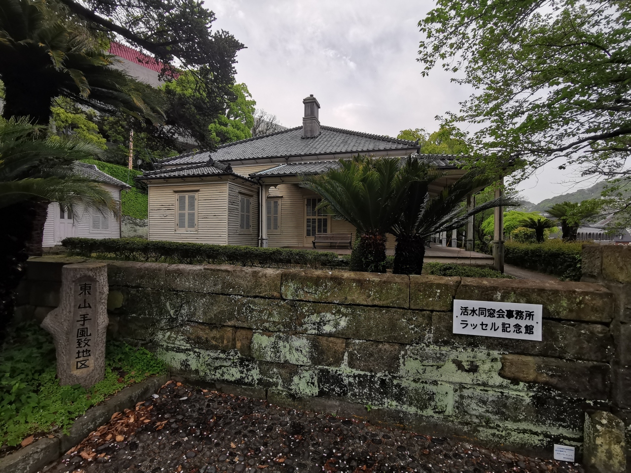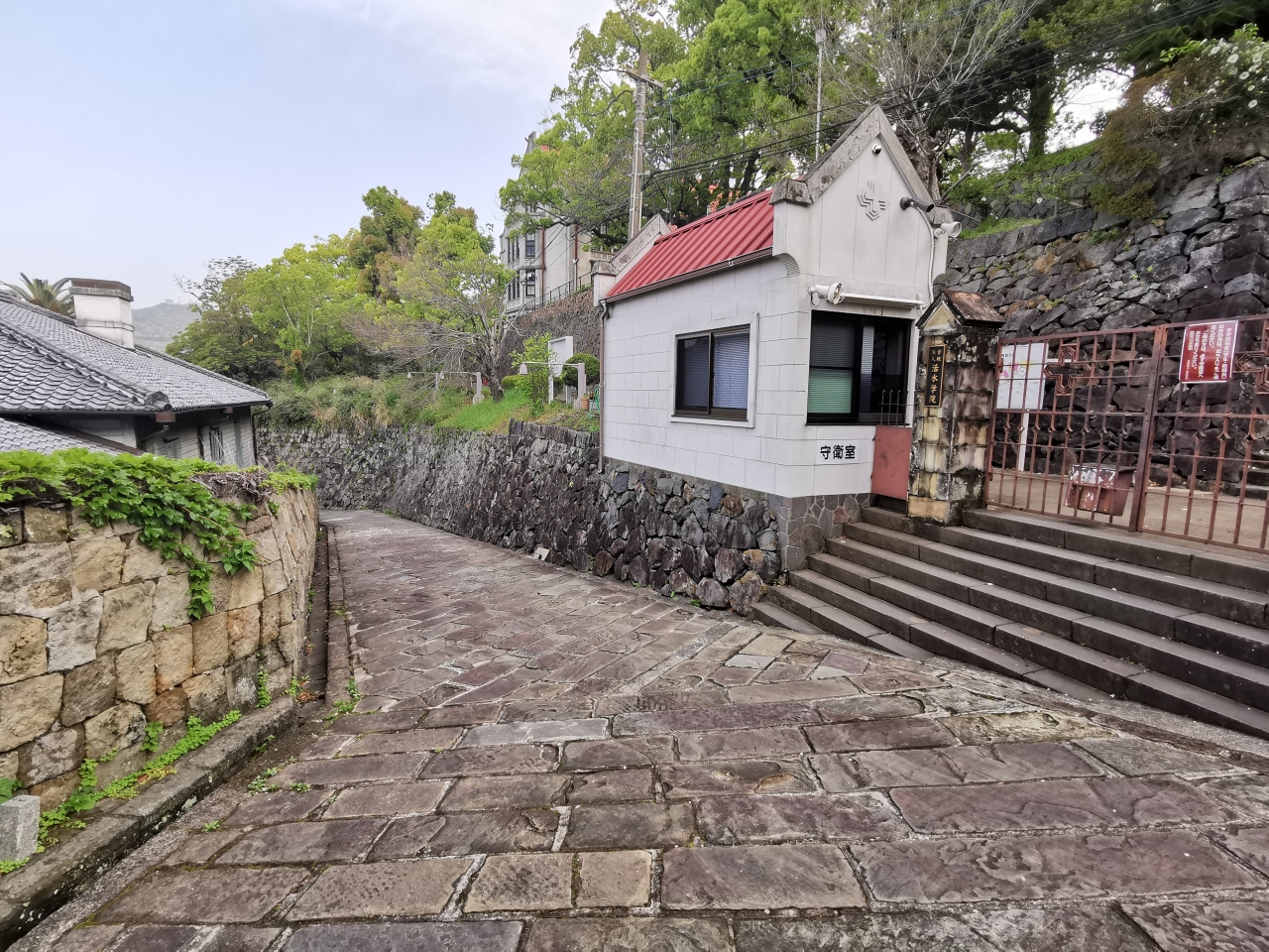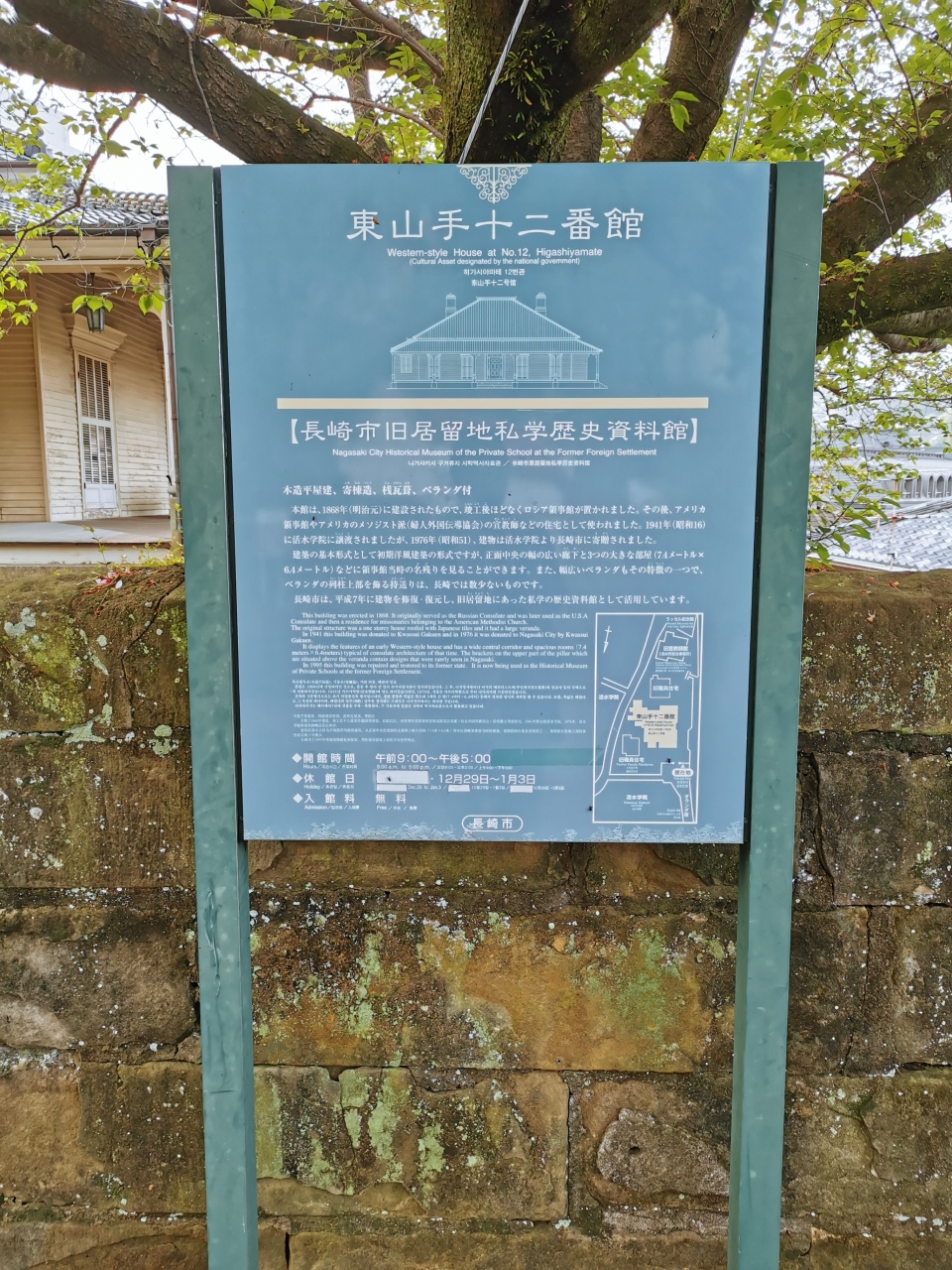 東山手十二番館はオランダ坂から分岐して東山手甲十三番館を通った先。活水女子大学 東山手キャンパスの入り口(守衛さん常駐)の辺りにあります。薄いクリーム色の平屋の西洋建築物です。1868年に建設され、東山手地区では現存最古の歴史的建造物だそうです。国の重要文化財にも指定されています。十三番館と比較してこちらの方が個人的には親しみやすい雰囲気でした。