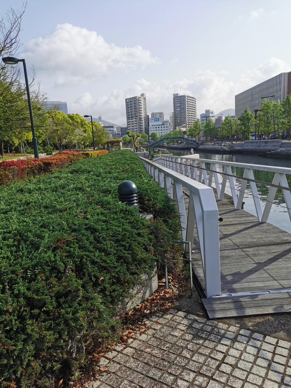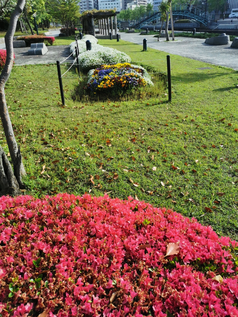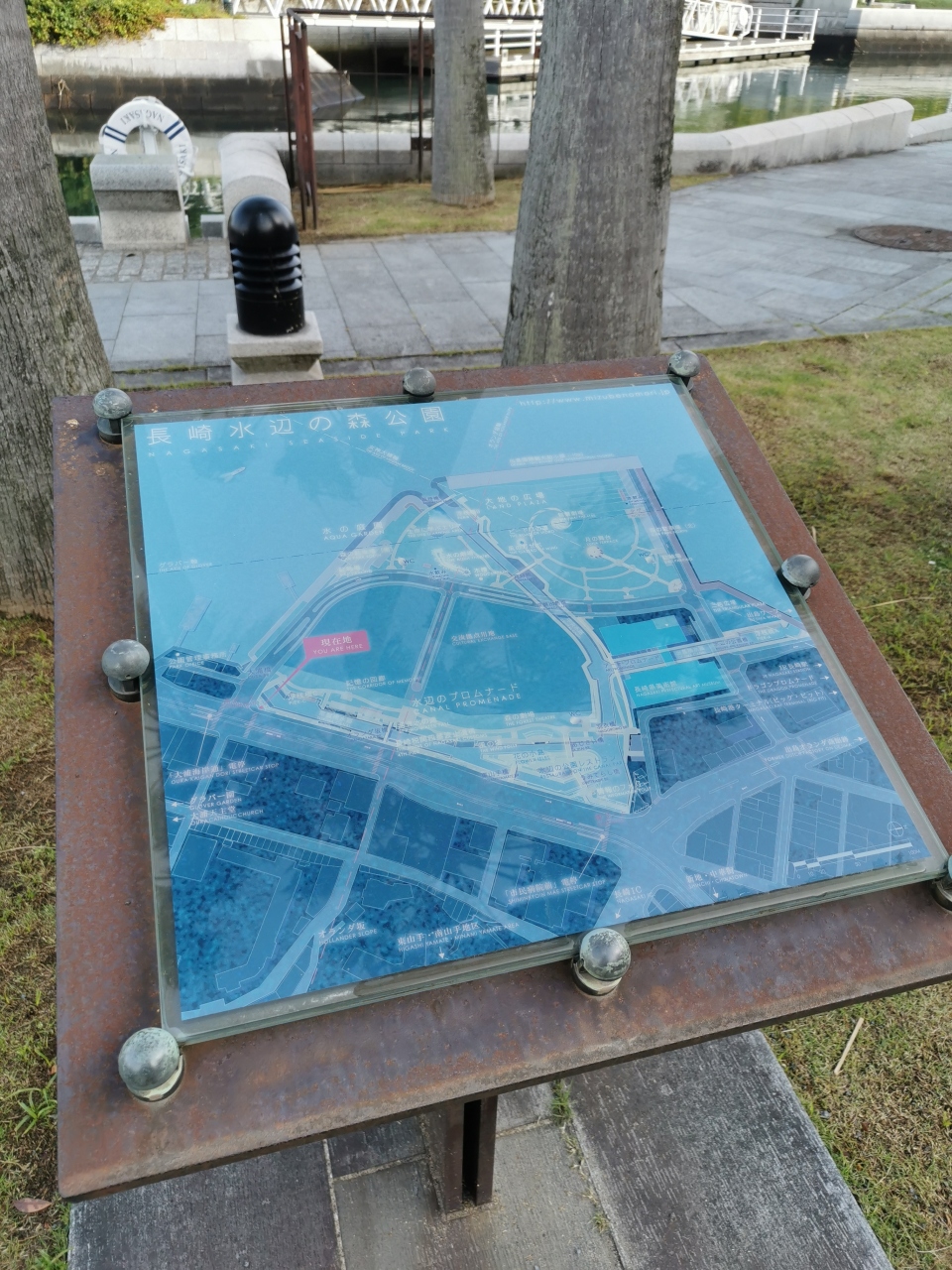 長崎水辺の森公園は長崎港に面した広大な公園でした。海岸通り沿いは水辺のプロムナードとなっていて、運河の水と緑と綺麗に咲いた花がとても綺麗な公園です。公園利用者向けの広い駐車場も完備。公園の海側から対面の三菱造船などがはっきりと見えます。散歩の方、観光の方など、午前中でしたが人は多かったですね。