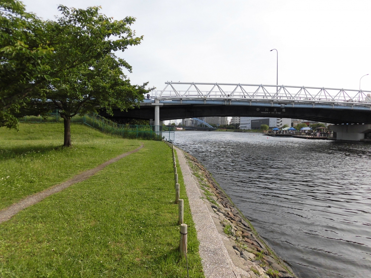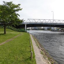 都営新宿線の東大島駅が地上に出た場所のホーム下を流れています。河川敷は江東区側と江戸川区側に分かれていますが、どちらも良く整備されています。河川敷は水辺が近くて、初夏から秋は、ハゼ釣りでにぎわいます。散策したときは、クローバーが咲き始めてきれいでした。人も少なくてのんびりしていると、水面を静かにカヤックが通り過ぎて、都内とは思えないスポットだと思います。