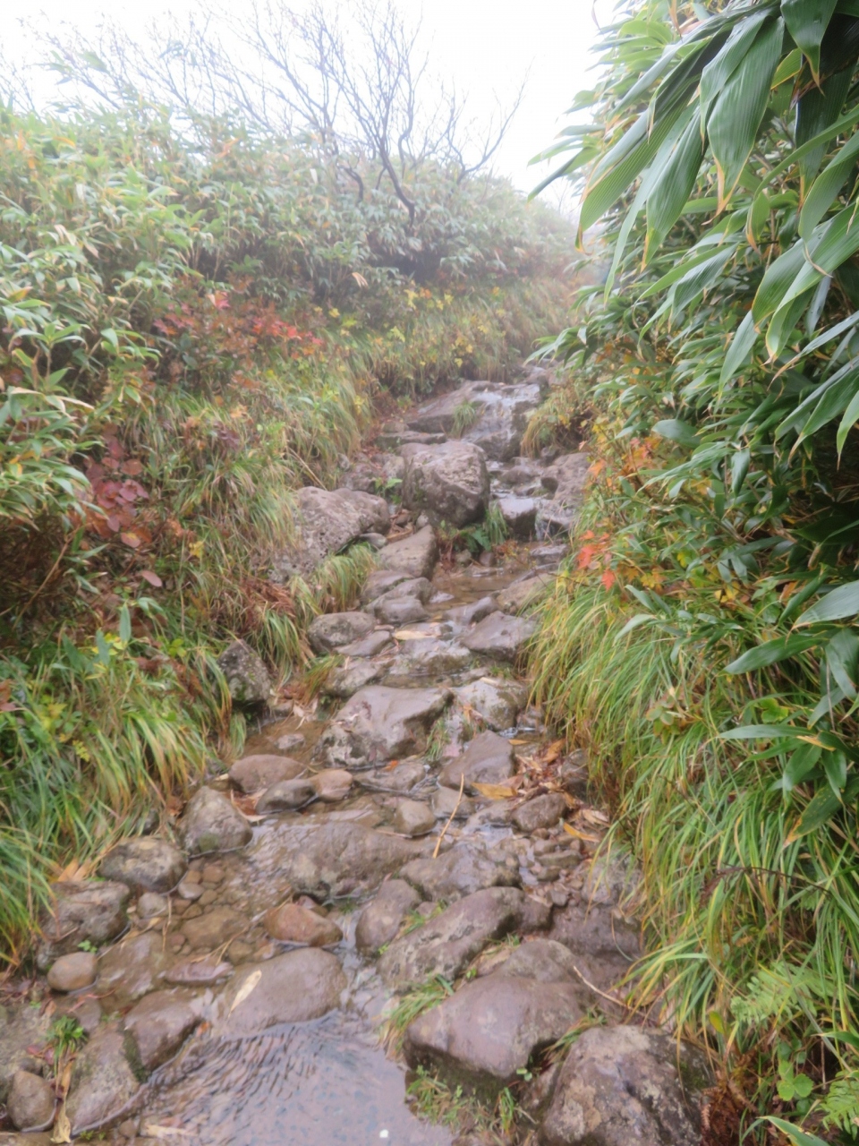10月初めに紅葉を求めて、月山登山しました。下界は快晴でしたが、標高を上げるにつれ霧、曇りとなり、弥陀ヶ原から月山登山口を登るころには雲行きが怪しくなりました。前日の雨で水が出ており、防水トレッキングシューズでないと通れないところがいくつか。途中の山小屋(休業中)で霧雨が始まり、その後、だんだん強く。山頂まで屋根が一切なく、雨宿りするところがありません。防水ウェアそろえていても、かなりぐっしょりになりました。覚悟して行きましょう。