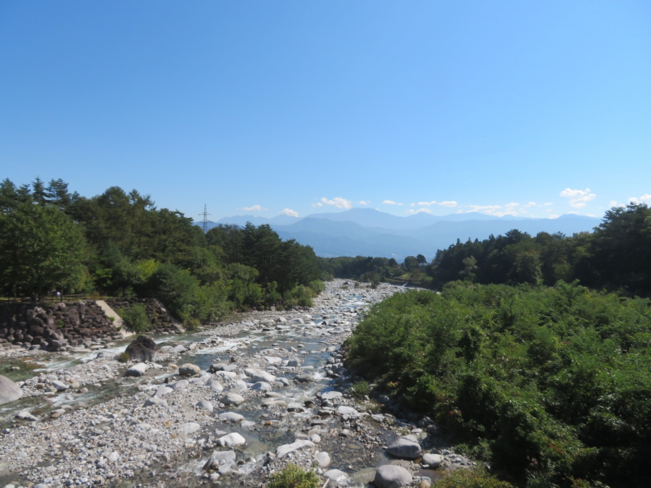 菅の台バスセンターから大田切川を渡ってアウトドア体験広場に行くのに利用する、歩行者専用の吊橋です。川の中央部から、駒ヶ岳を遠望できます。橋はそんなに広くなく、写真を撮る人がいると、その後ろをギリすれ違えるくらいです。ベビーカーは無理かも。