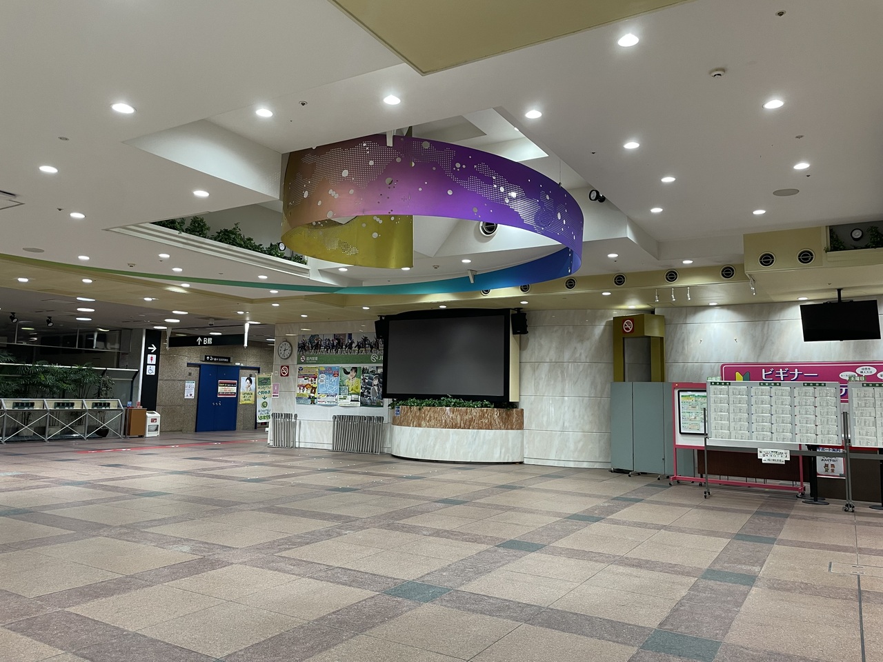 立川駅南口、錦町商店街の繁華街にあるJRAの場外馬券売り場です。周辺はお客目当ての飲食店も多いですが、平日は近所のビジネスマンがランチに訪れるくらいで館内は閑散としていました。建物内は通り抜けもできます。
