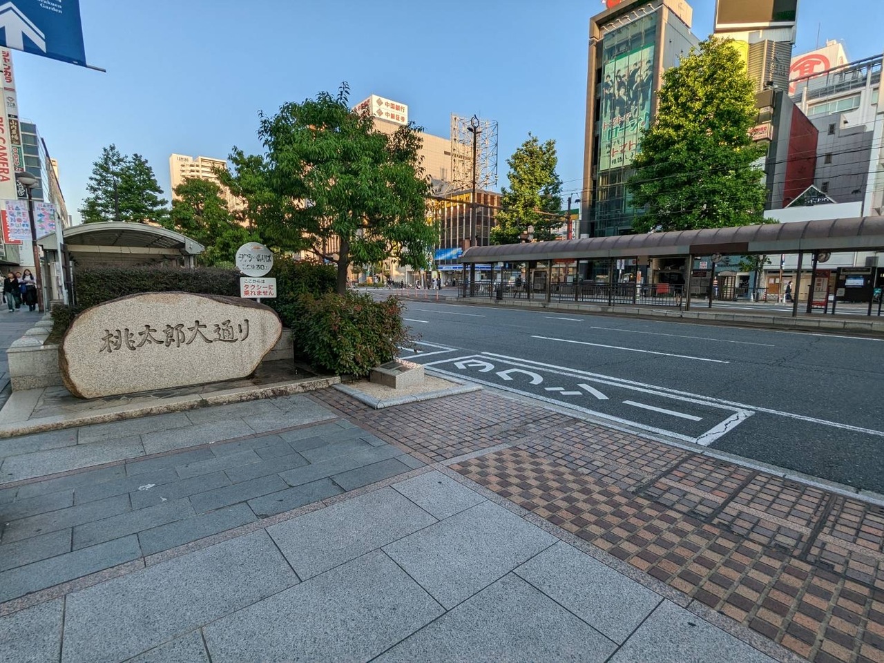 岡山駅前から続く大通りが「桃太郎大通り」です。岡山市内のメインストリートで、通りの中央には路面電車が走っていましたし、交通量もかなり多かったです。通り沿いには商業施設やオフィスビルなどがたくさん並んでおり、人通りも多く活気がありました。