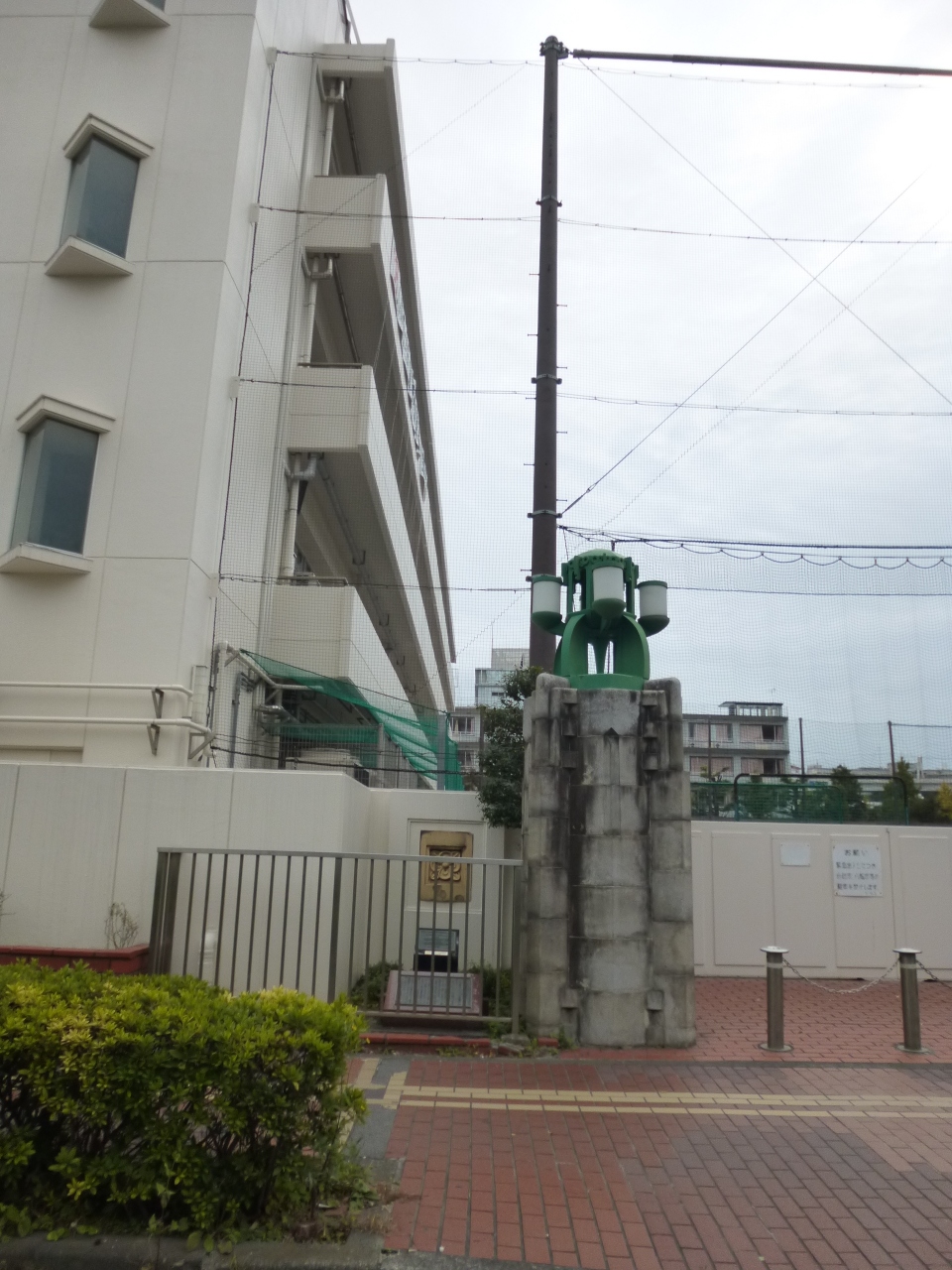 白い門柱が印象的な延平門の近く、中学校のすぐ前に碑があります。この中学校の門柱として使われているのが、旧花園橋の親柱です。高速道路の建設により派大岡川が埋立てられ、花園橋が廃橋となった際、ここに移築されたそうで、こういう形で残されるのはとても良い案だと思いました。