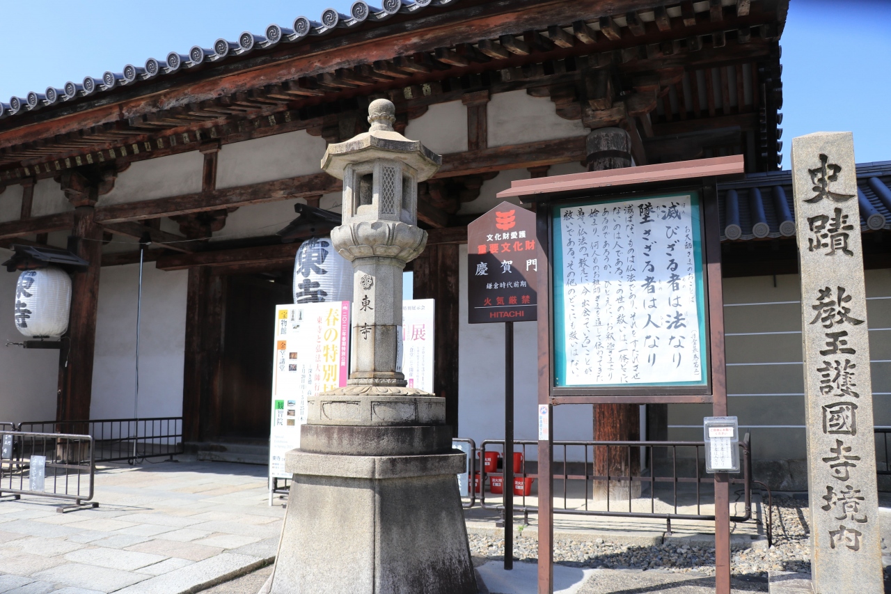 東寺へ参拝する際はここ慶賀門か南大門から入る形となります。京都駅や近鉄の東寺駅はこちらの方が近いので徒歩や市バスを使っての訪問時には使うこともあるかと。門自体は横幅がそこまで大きくないので入場専用となっており、退場時や車利用の場合はその脇を使うことになります。夜間拝観の際は通常とは異なりこちらで拝観券の販売が行われますが、時間前は大変こんざつするので混み合うタイミングは避けるのがベター。また、平らでスムーズに出入りできるように見えますが2歩分ほど段差になっているので足元には気を付けたいことろです。