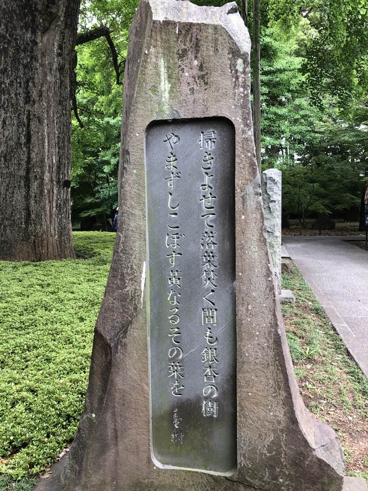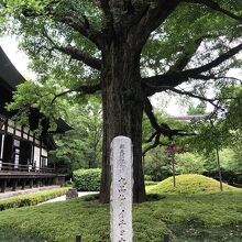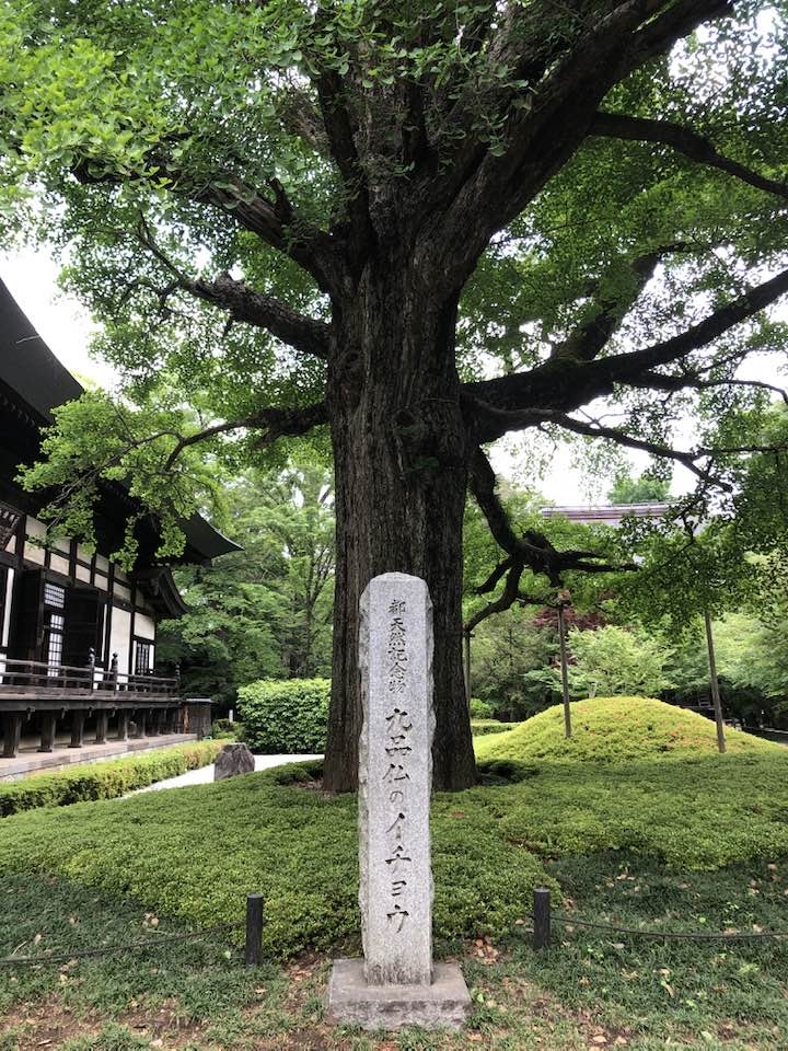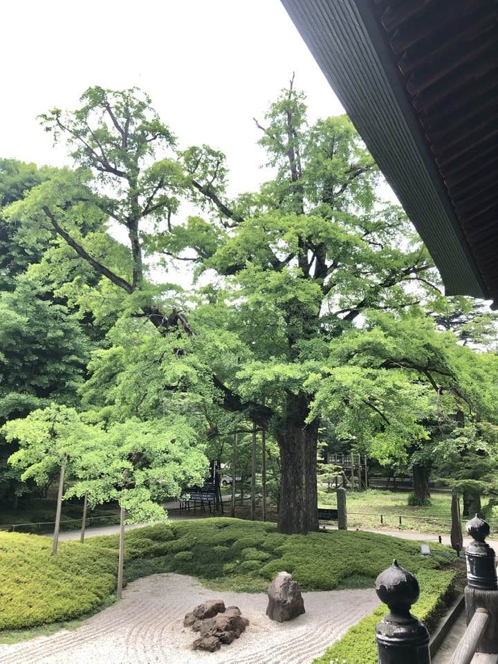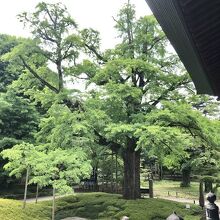 正面に「新天然記念物」と石碑が建っており、横に歌碑もありました。見上げるイチョウの木は大きく背も高かったです。本堂に入り、横の縁側に出ると立派な石庭を見ることができます。その横に先ほど見上げたイチョウの木を後ろから見ることができます。