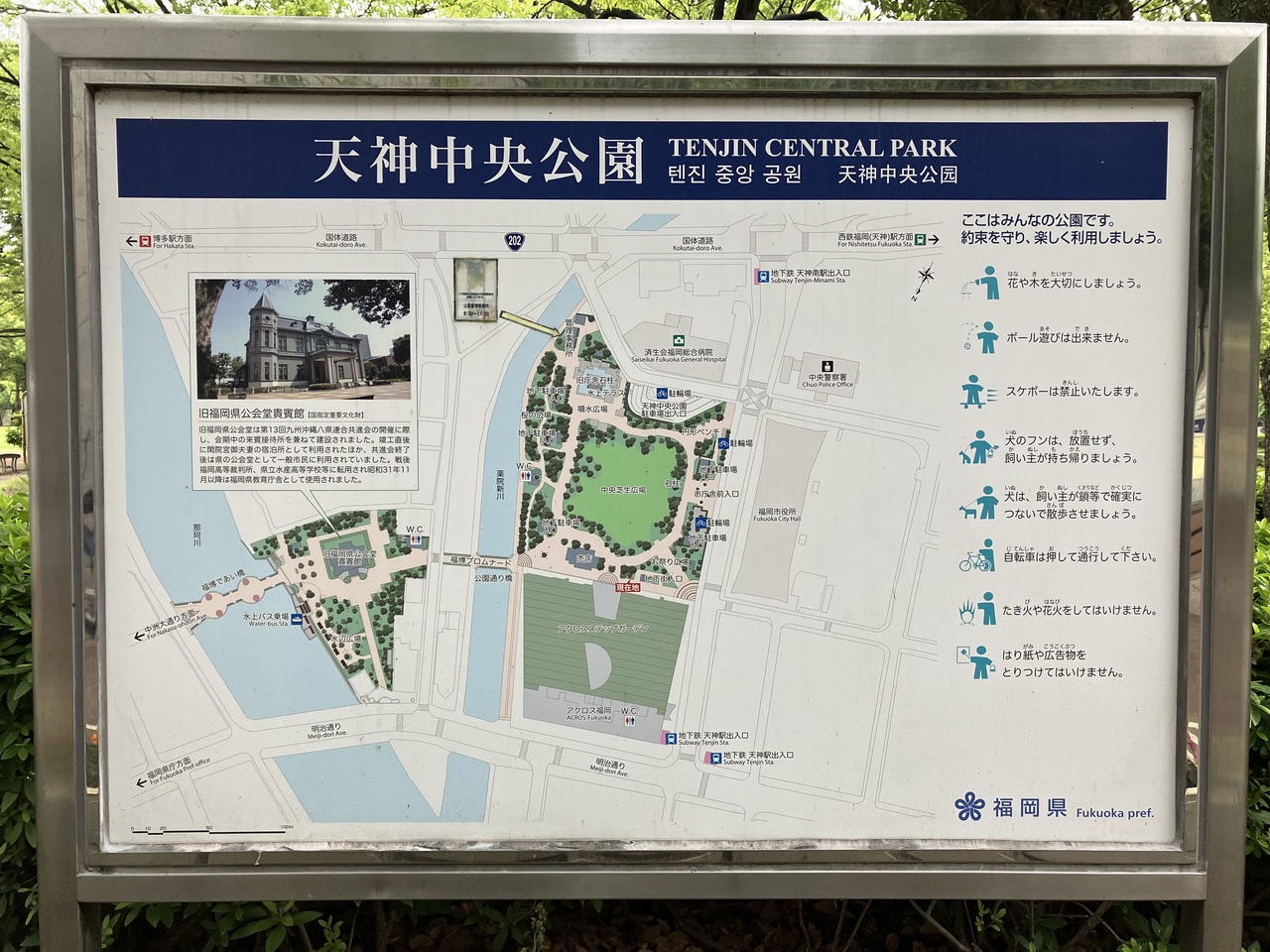 天神エリアにある文化施設アクロス福岡の隣に位置する公園です。アクロス福岡の前には青々とした芝生が広がるゾーンがあり、橋を渡っていくと旧福岡公会堂の貴賓館があり、文化的な香りも漂う公園です。ちょうど貴賓館の前のエリアではイベントが開催中でした。
