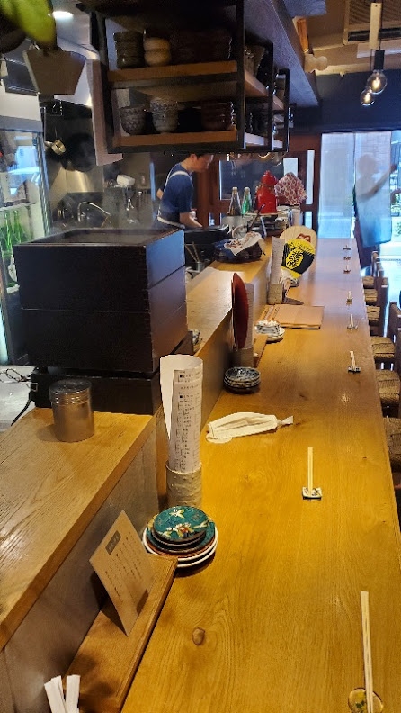 店内はウナギの寝床のような造りで、カウンター中心のこじんまりとしたいい感じの雰囲気で、カウンターを背に、2人用テーブル×2、一番奥には4人?のテーブル席で、カウンターメインの好きな造りですし、席も身体大き目の野郎でも十分余裕のあるスペースで、特にスタッフさんも非常に気さくで接客も丁寧です。