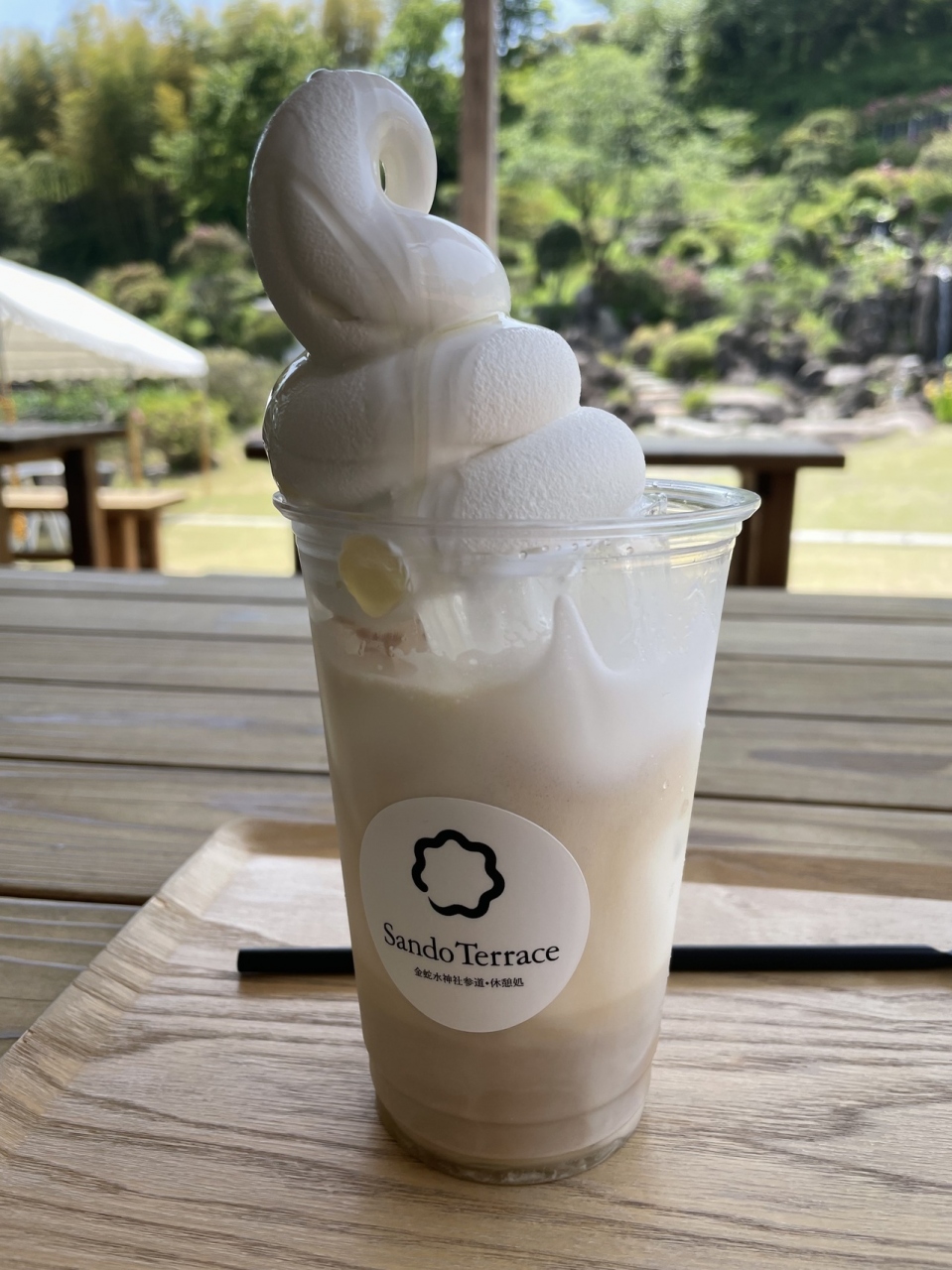 古くからある神社の休憩処としてはかなりモダンな建物と雰囲気。お参りの休憩に立ち寄り、お茶や軽食を頂くだけでなく、地域の企業とコラボしたお土産品も販売しているので、ここならではの物が買える。タイミングが合えばお花の時期に隣接する庭園で花々も楽しめる