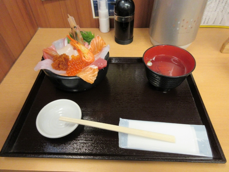2条市場を散策して、どこで海鮮丼を食べようかと探してみました。どこが良いか迷っていたら、通りを隔てた所に海鮮丼が描かれた店があったので入りました。中にはそれなりに人が入っていました。おまかせの海鮮丼を頼んだら、それなりに美味でした。