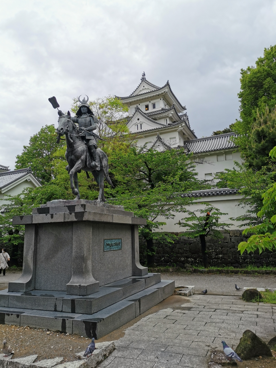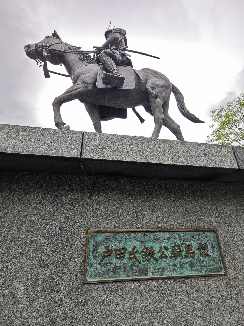大垣公園の大垣城天守閣の目の前に戸田氏鉄公騎馬像がたたれています。戸田氏鉄(とだうじかね)は、美濃大垣藩の初代藩主。立派な武者乗馬像です。銅像は1994年建てられたものだそうで、背後の大垣城天守閣とあわせて写真スポットです。