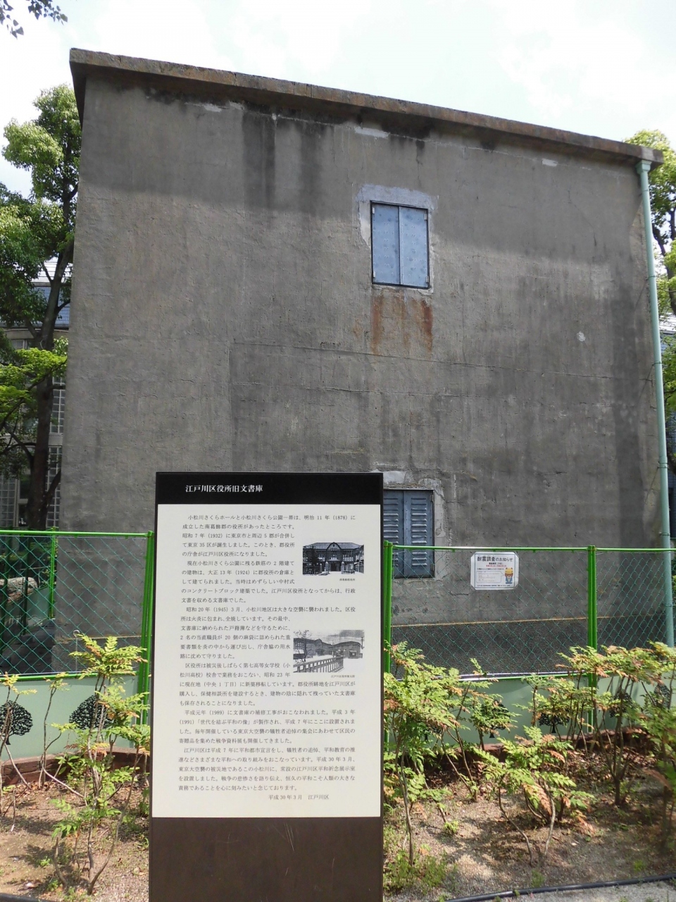 江戸川区の小松川さくらホール敷地内にあります。この辺りは東京大空襲で住宅などが全滅に近い被害を受けたそうですが、この江戸川区の書庫だけは奇跡的に残ったため、今でも大切に保存されています。今では周囲は区画整理もされて、マンションなどが立ち並んでいるので、何かこの場所だけがタイムスリップして残っているような景観でした。