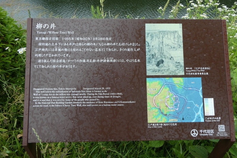 桜の井と対をなすようにある柳の井です。といっても、両方とも井戸に名付けられたシンボルマークの木がまわりにたっぷりある…とか、そういったことはありません。屋号みたいなものなのでしょうか。こちらのほうが皇居の濠に近いところにあり、都の指定史跡になっているパネルを見ることができます。