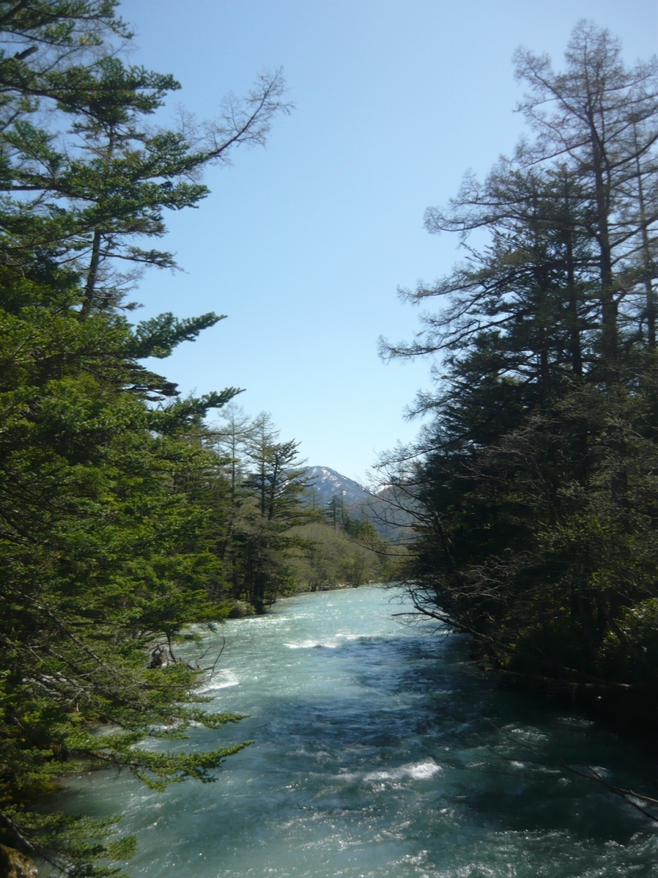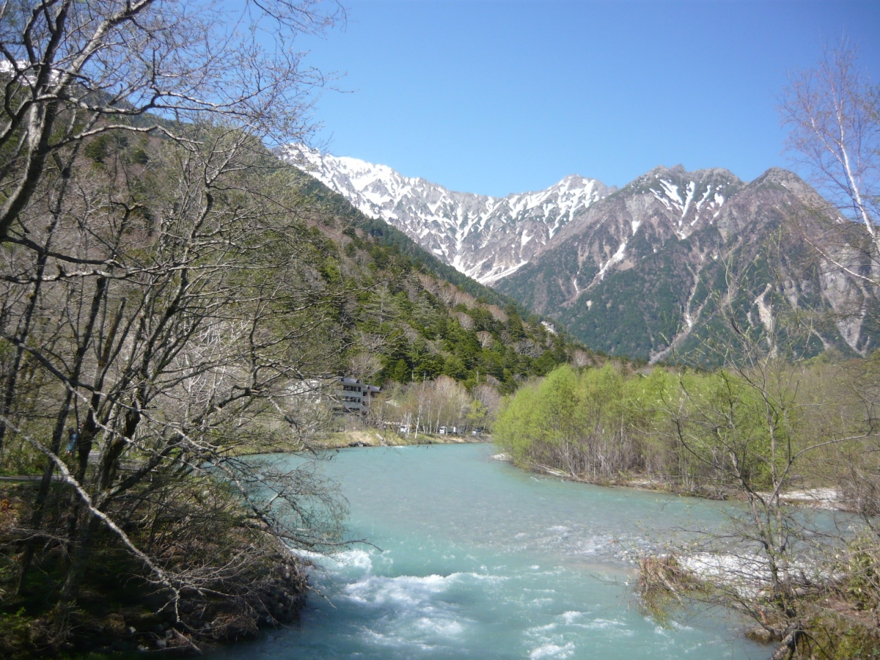 河童橋から大正池方面に梓川沿いを15分程進んだ先に中洲を挟んで東側が田代橋、西側に穂高橋が架かっています。小さな橋で誰も気に留める様子はありませんが、訪れた時は天気が良く、橋の上から望む雪が残る穂高連峰や梓川の澄んだ流れの風景はとても良かったです。