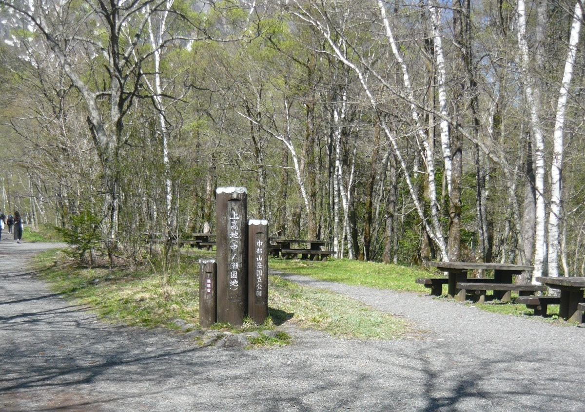 河童橋より梓川沿い左岸を15分程歩いた田代橋の近くにあります。白樺などの木々に囲まれたちょっとした広場のようになっていて東屋やテーブル、ベンチ、トイレなどが整備されていて、トレッキングをするときのちょっとした休憩スポットとして良い所です。