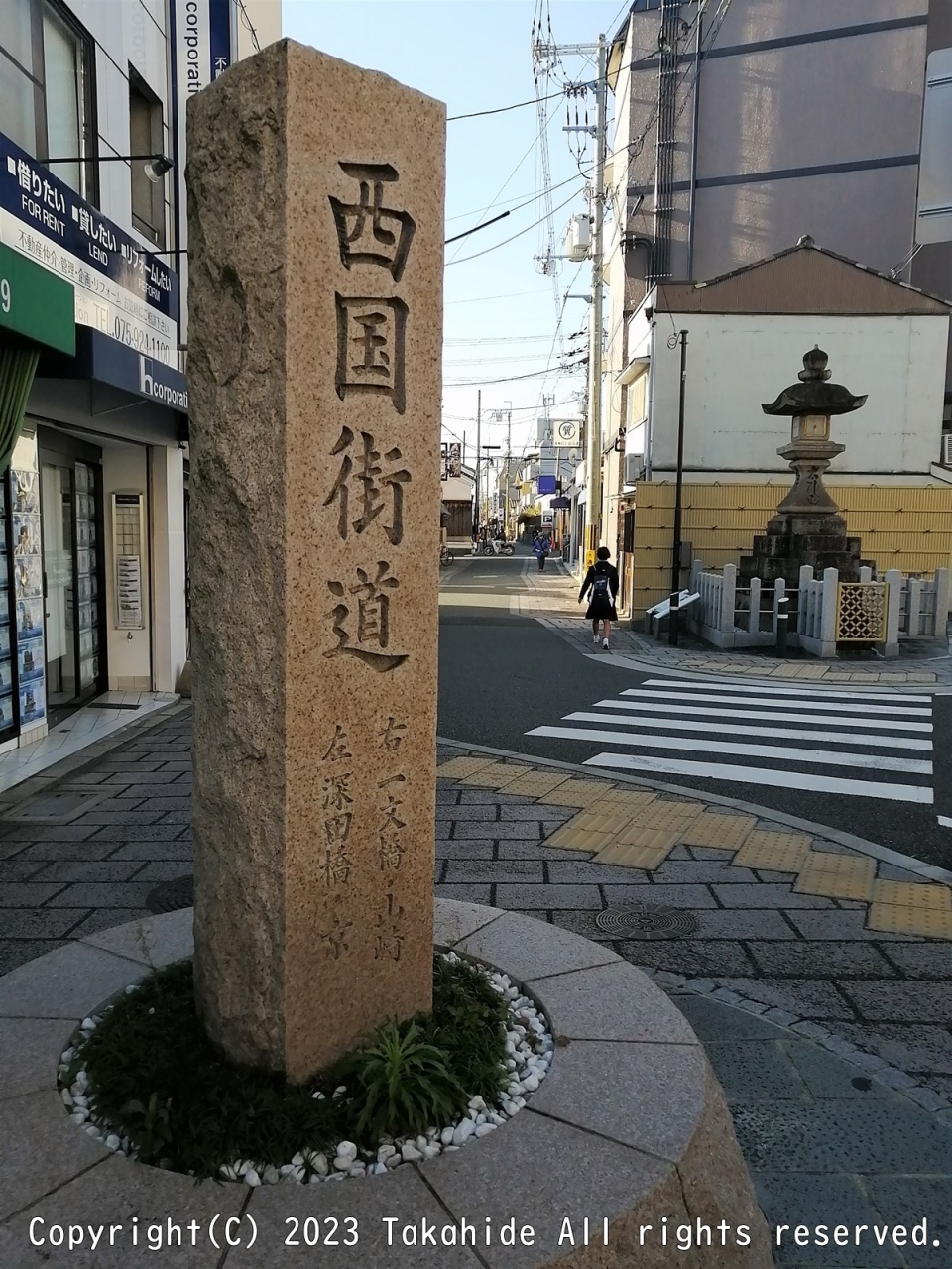 阪急東向日駅を出て直ぐ右側、西国街道と府道206号(西国三十三所巡礼路)との分岐路に立つ市内最大の常夜灯です。