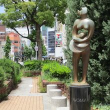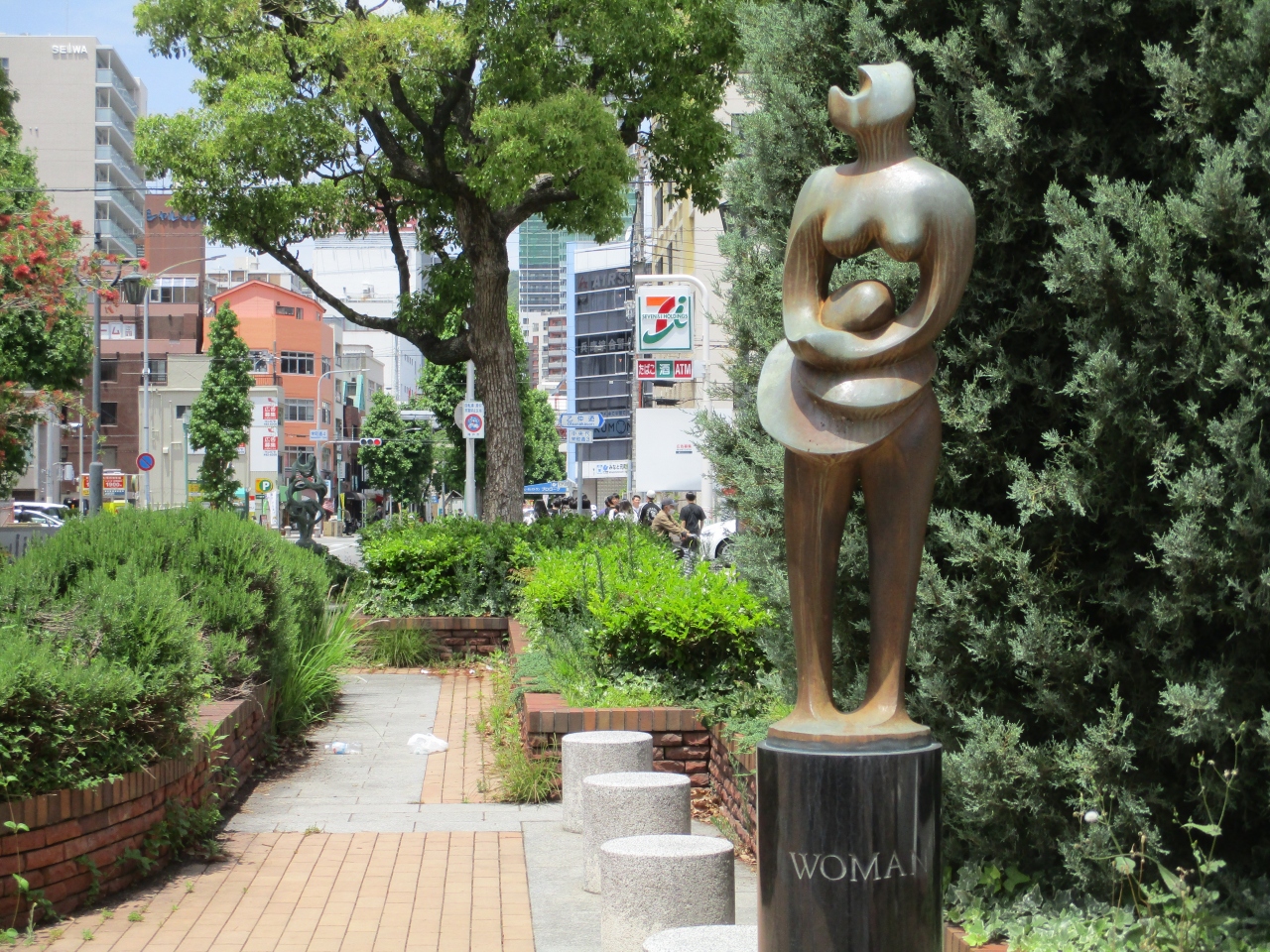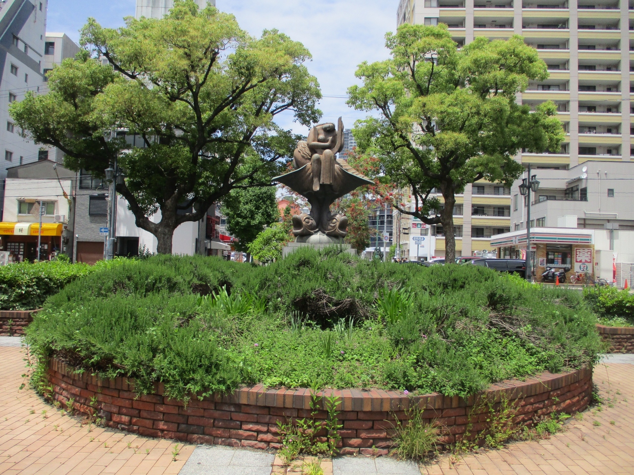 乙仲通りに買い物に行く時、こちらも久しぶりに通りました。タワーロードと乙仲通りが交わるところに中が広場のロータリーがあります。広場には彫刻家、新谷澤子氏、新谷英雄氏の作品があります。ベンチもあります。日をさえぎるものがないので夏場はかなり暑そうです。