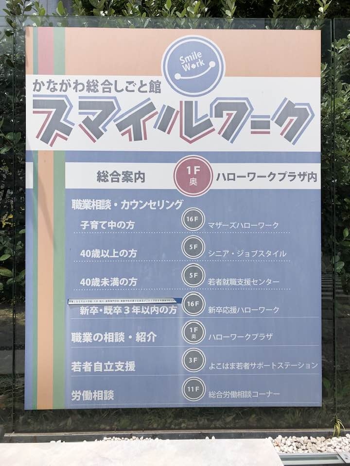 ジョイナス地下街を、直進し南10番出口からわりかしすぐあるオフィスビルです。レストランも入っていますが主要なテナントはハローワークではないでしょうか。表にも「かながわ総合仕事館 スマイルワーク」の案内が出ています(かなり色あせていますが・・)世代別に細かく分かれています。