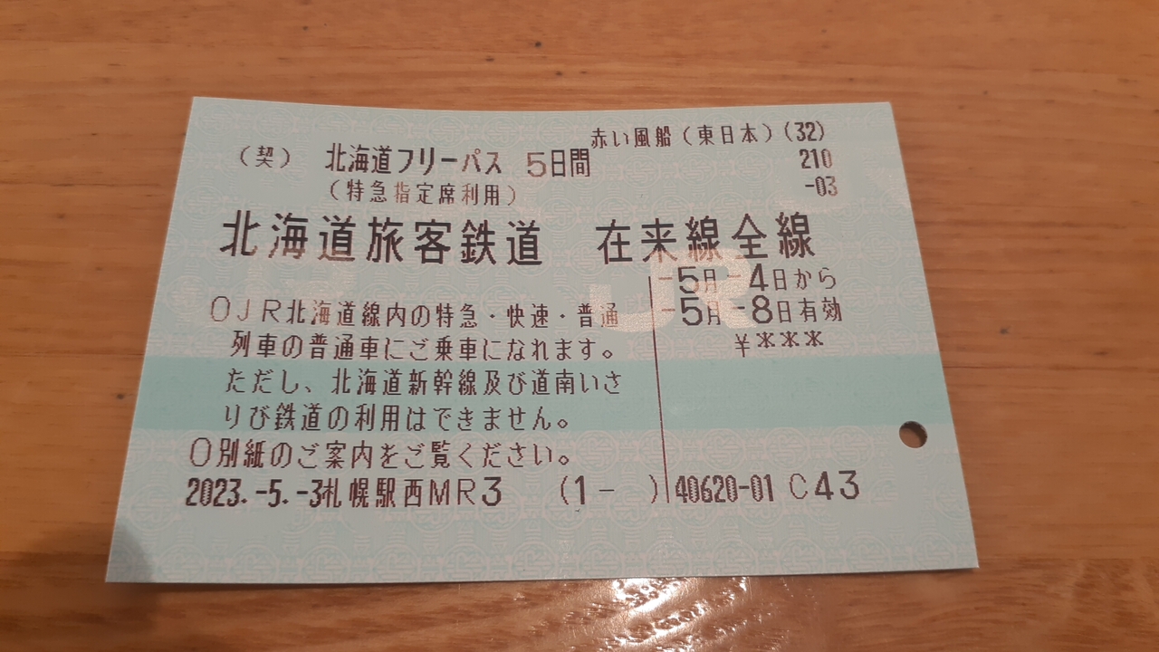 北海道フリーパスといえば、駅で発売している27,430円で特急を含むJR北海道の在来線全線が連続する7日間利用し放題の切符をイメージするかと思いますが、それとは別に24,800円で特急を含むJR北海道の在来線全線が連続する5日間利用し放題となる切符があります。