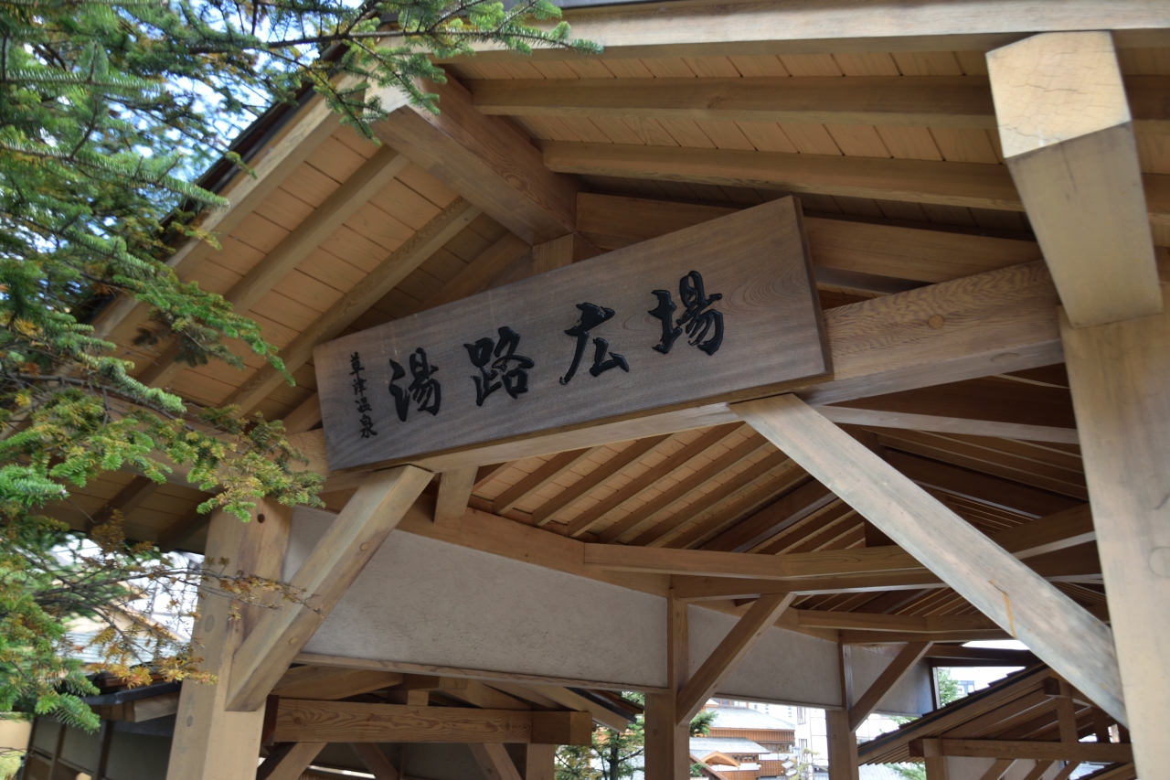 草津のメインスポットである湯畑の前にある広場です。広場には木造で作られた休憩所が設置されています。ベンチもある為、座ってくつろぐこともできます。湯畑を望むことができる場所にあり、観光客で賑わっています。