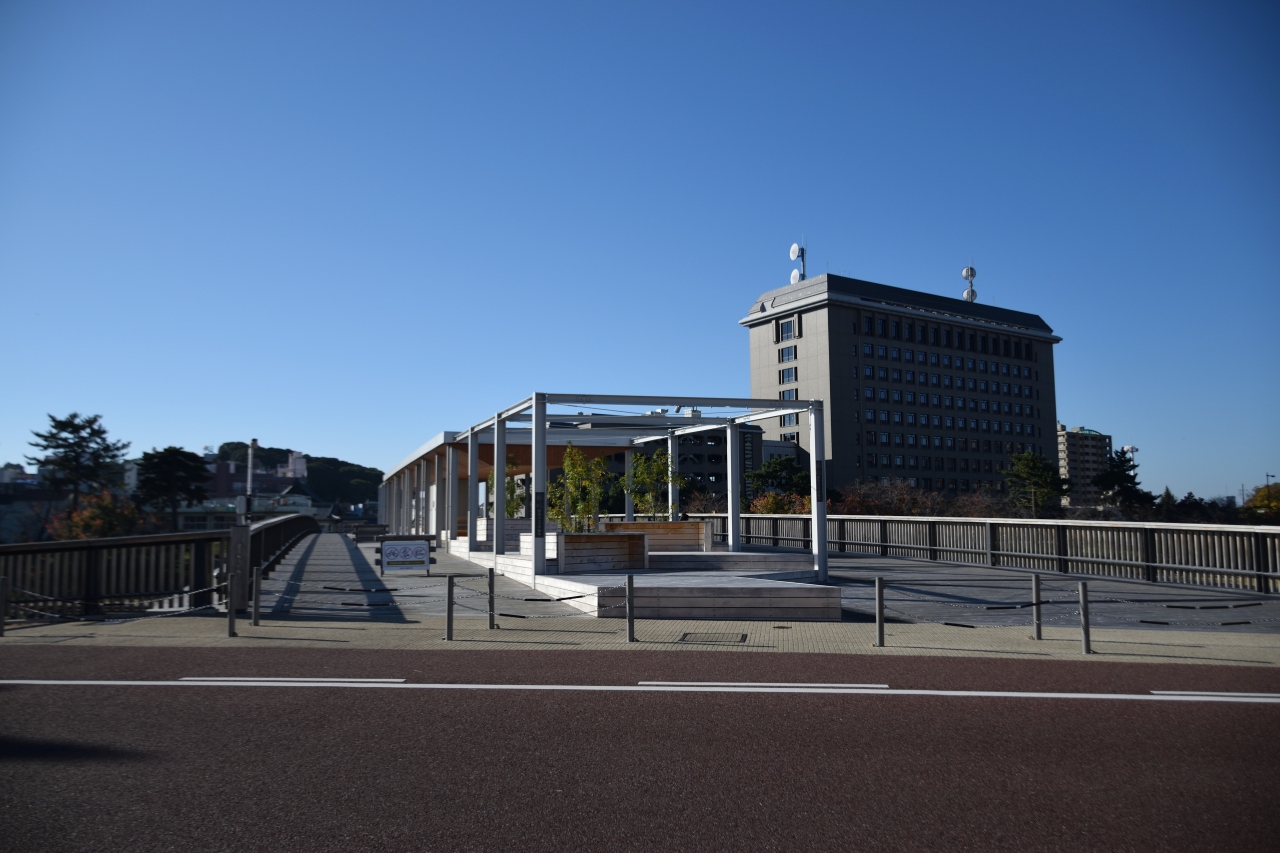 中央緑道からまっすぐ進み乙川を渡る橋です。桜城橋は歩行者専用の橋で自動車は通行することはできません。自動車も通行できるほどの幅は設けているため、かなりゆとりを持って通行できます。橋の真ん中にベンチなども設置されており、休憩できます。
