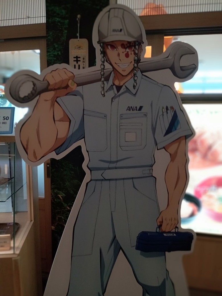 羽田空港の60番ゲートの近くにあるANAフェスタさんです。ここはおにぎりやうどんなど早く安くいただけるメニューがそろっています。おにぎりとからあげ、あまり具のないみそ汁がセットになったものもあって手軽にいただけるのがいいですね。目印は、鬼滅の刃の柱、宇髄天元です。子どももよろこびそうなお店です。