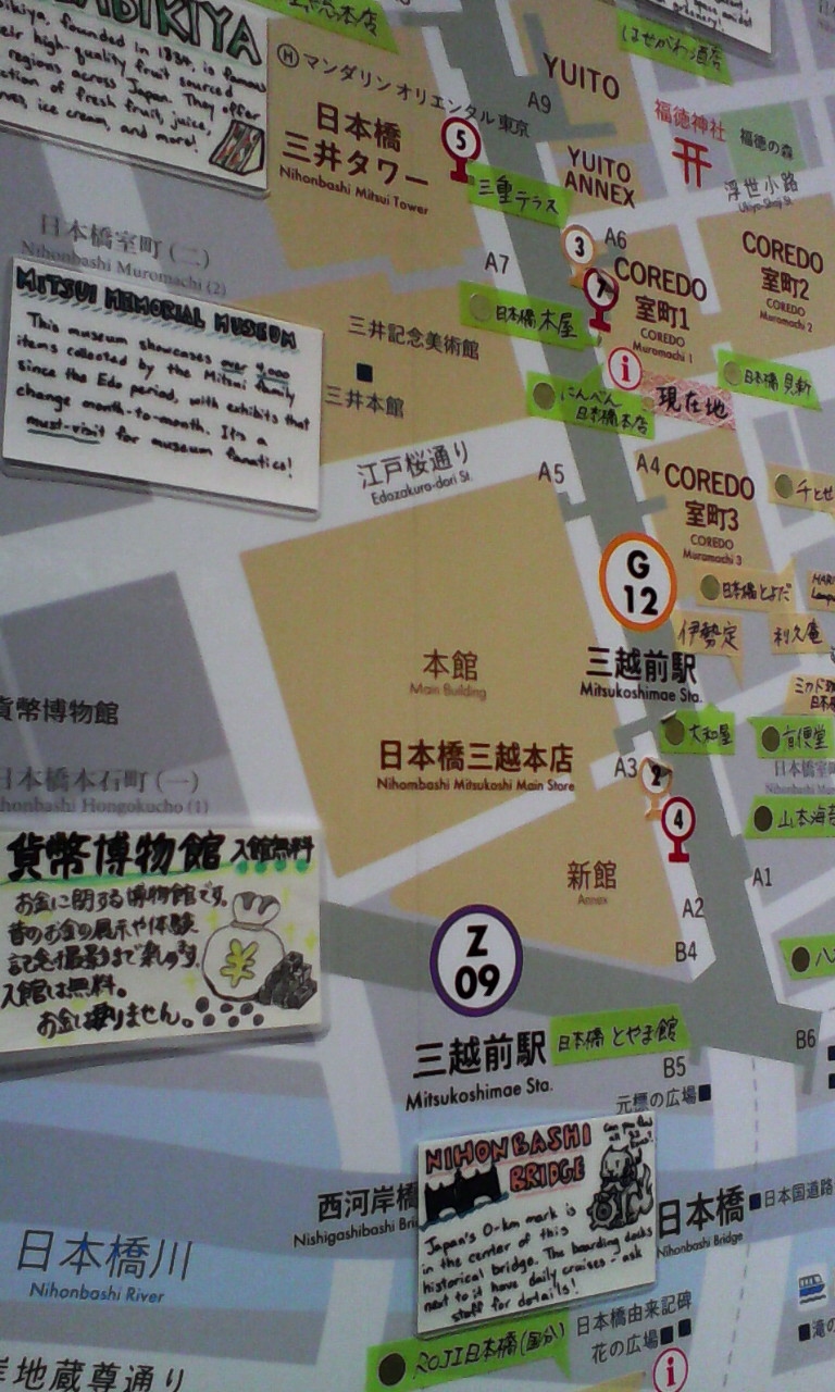 コレド周辺の観光名所を示した地図があったのですが、手書きでオススメのお店やイラスト入りの説明が貼られていてフレンドリーな感じが良かったです。