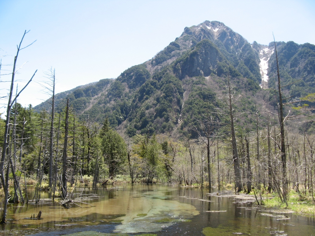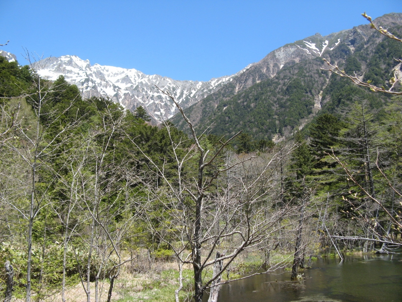 5月の中旬に梓川右岸沿いを河童橋から明神、徳沢方向までハイキングしました。コースは湿原などには木道が整備されていて歩きやすく、原生林の木の間に雪が残る穂高や明神岳が見えたり、神秘的な明神池など絵の様な景色が素晴らしかったです。途中、猿がたくさんいて驚いたし、熊の糞らしいものもあったので熊よけの鈴を用意すべきだったと思いました。