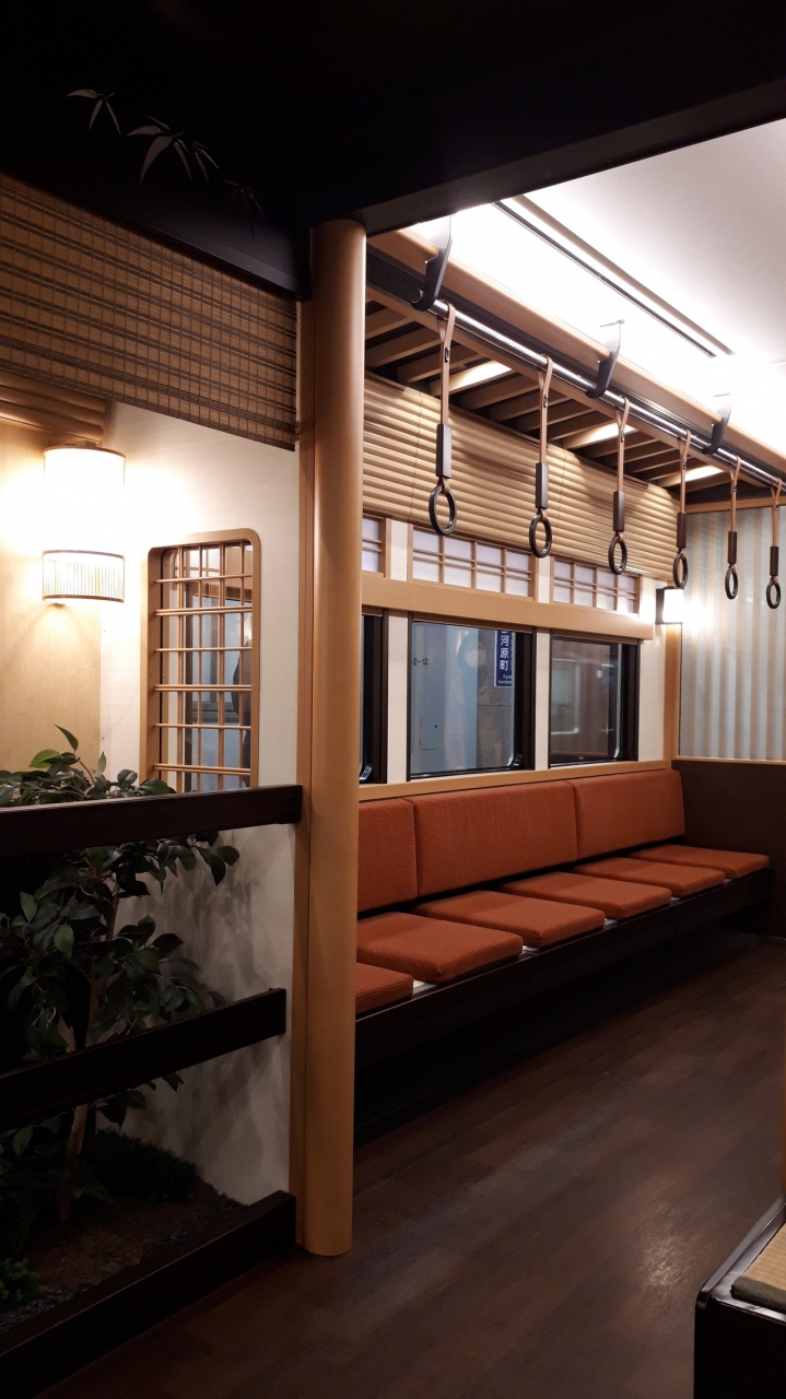 車両によって作りは異なります。畳の座席や庭園があり、かなり凝った観光列車です。