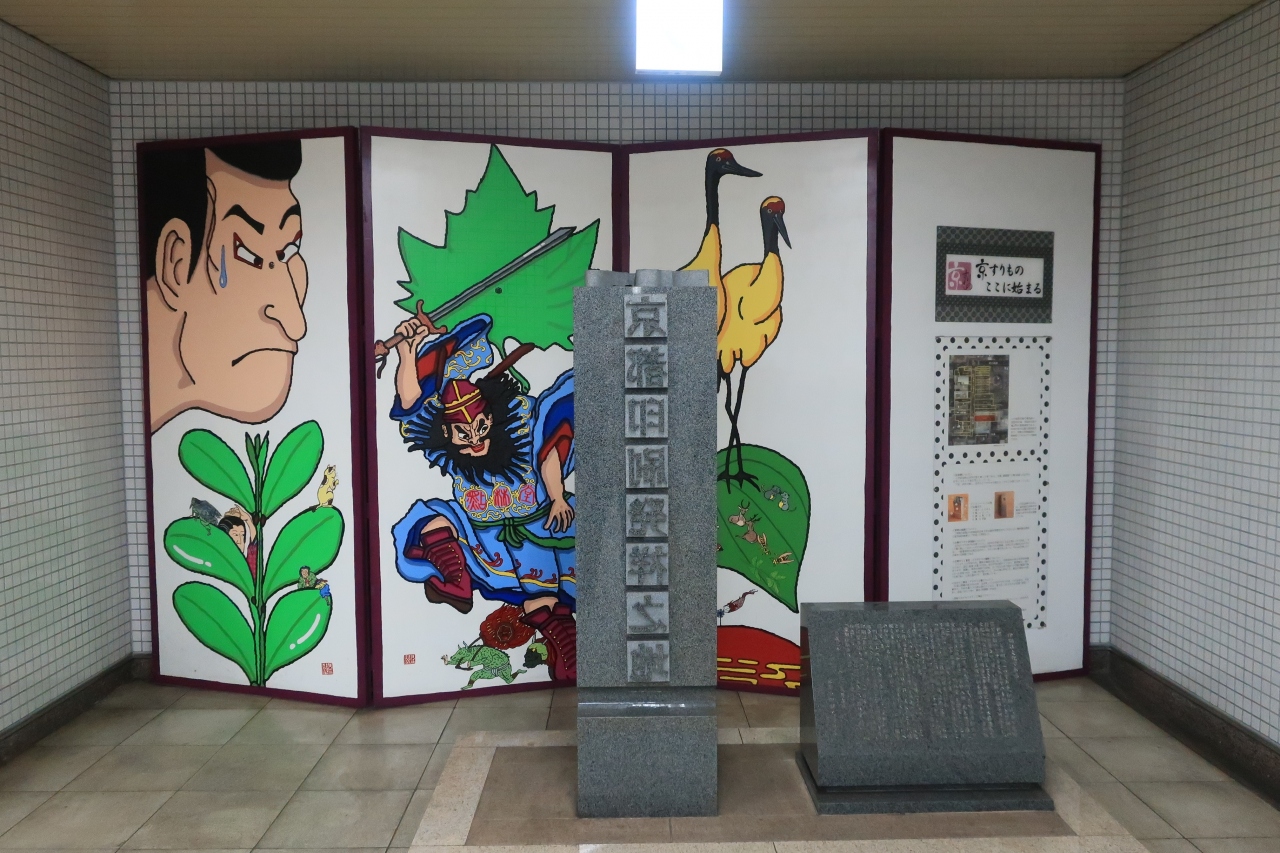 この碑の存在は知っていたが、場所がわからず、探した。駅構内だとは思わず、無料の通路にあると思い込んでいたので見つからなかったのだ。明治初期の1870年、長崎で民間初の印刷所を起業した本木昌造は翌年、京都に門弟を派遣した。その門弟が碑のある付近で京都點林堂を創業。京都における近代印刷業の発祥地となった。碑の絵がユニークだが、ツゲは印刷用の木版がツゲで作られたことにちなみ、浮世絵は印刷の題材によく使用されたことをモチーフにしたという。