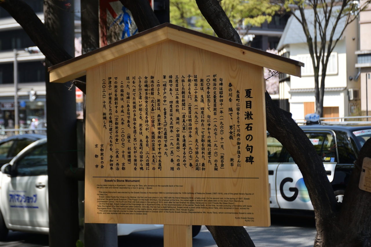 鴨川沿いで祇園の恋文を読んだ句があります。夏目漱石といえば、明治時代の小説家と思われがちですが、俳句なども読んでおり、各地にそのような句碑が残されています。京都で風情ある鴨川で読んだ句も後世に引き継がれてゆきます。