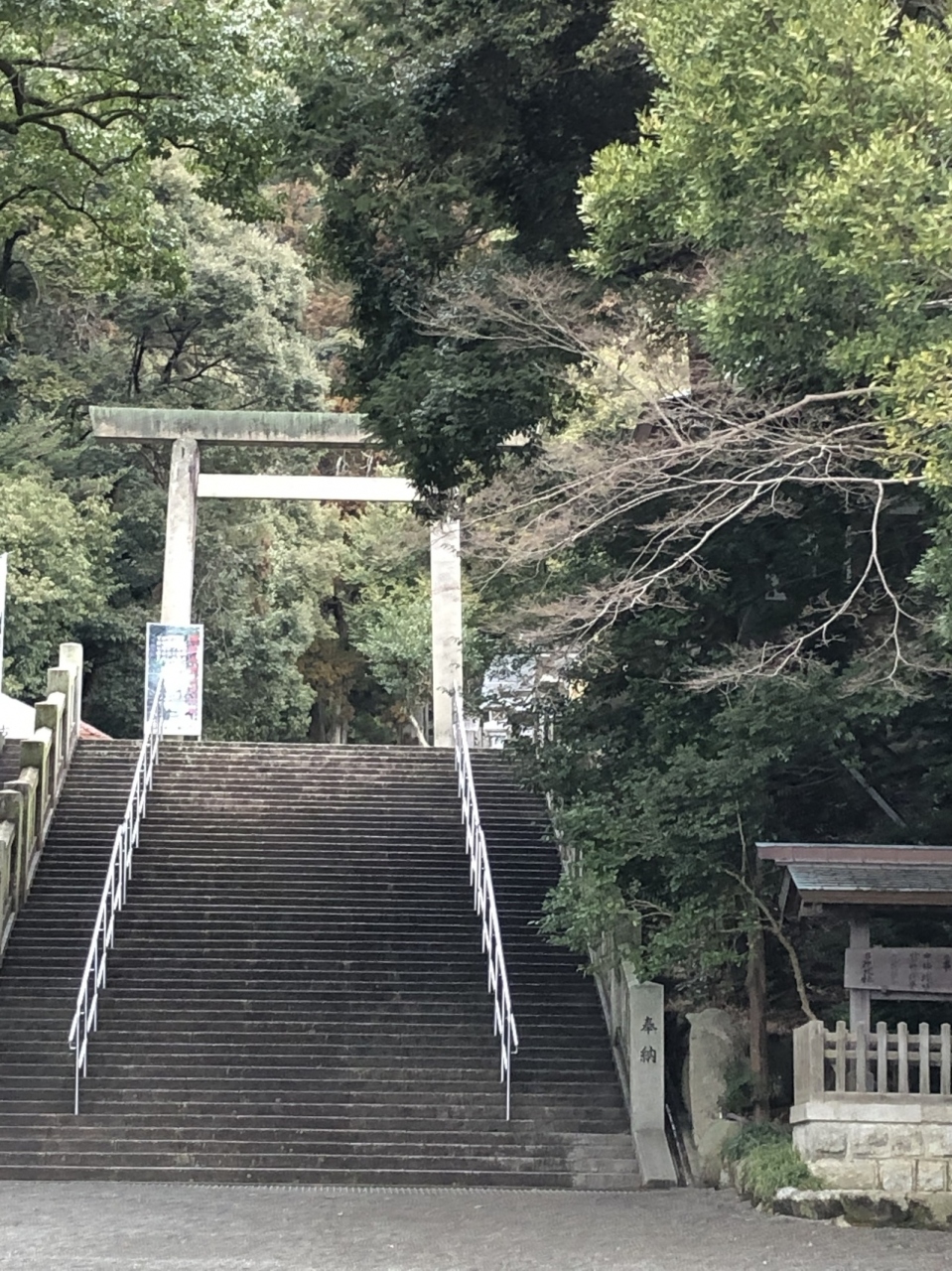 この辺りでは有名な神社です。木々のある階段を上がり、お参りします。