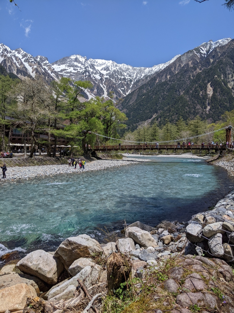 上高地のシンボルマーク的の河童橋です。昔に行った時も時々You Tubeでライブカメラを見る時もいつも混んでいるイメージでしたが、午前中はまだ空いていました。十数年ぶりに渡りましたがやっぱり渡ると揺れますね。思ったより階段が高かったです。
