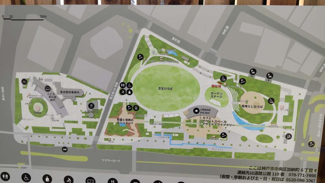 - 公園の直下に市営駐車場があります。三宮駅から徒歩10分強。元町大丸からは10分弱。