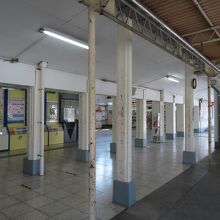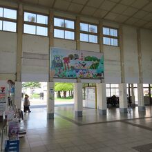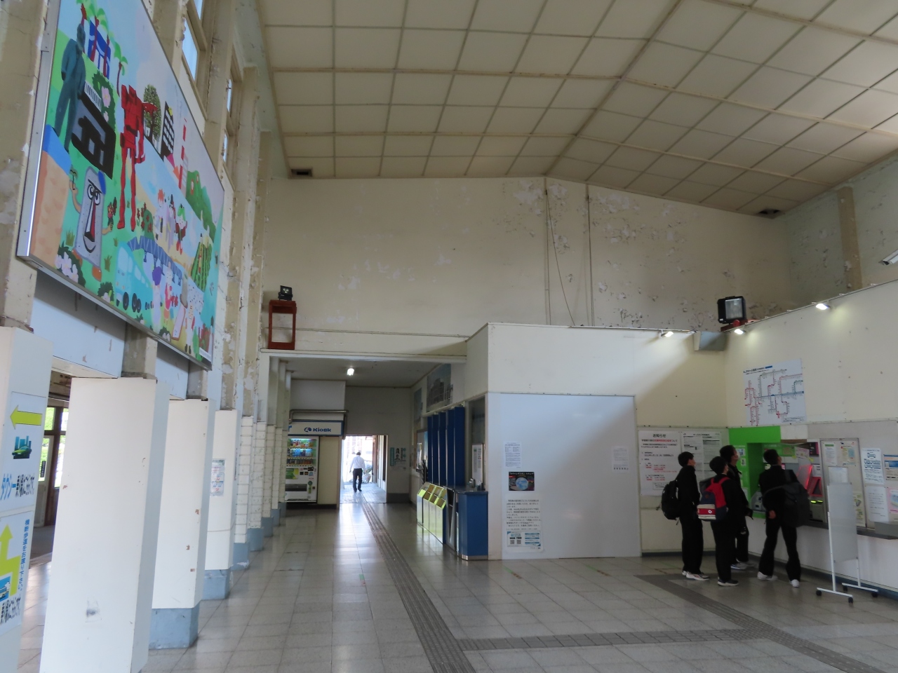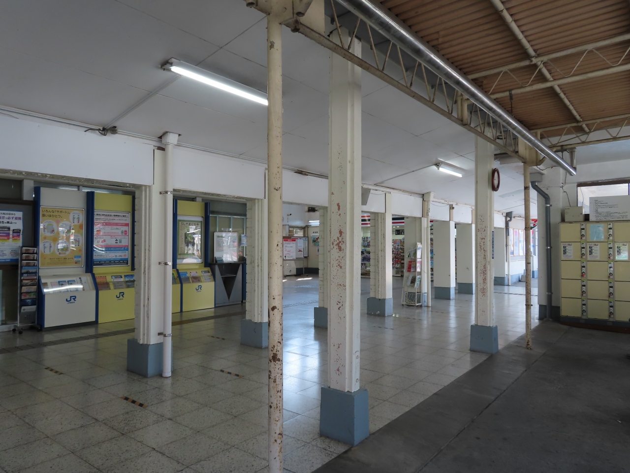 山陽本線の宇部駅は宇部市街から離れた所にあり、宇部市の中心はこの宇部新川駅周辺のようです。駅前にはレトロ感のあるバスターミナルがあります。駅舎は少し個性的。体育館みたいな雰囲気で、天井がやたら高くて柱が多い。