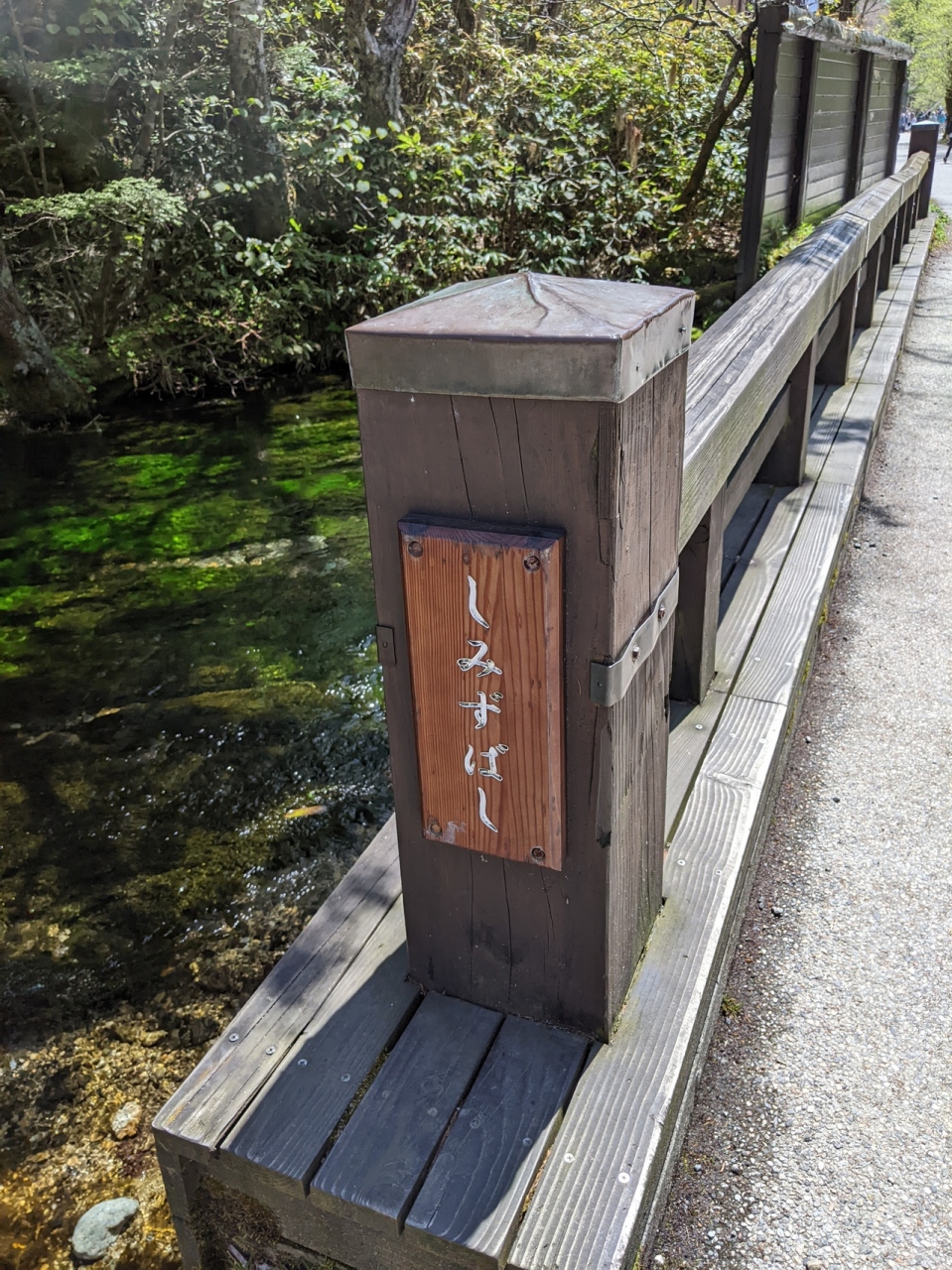 河童橋から明神池方面に行く時に通る橋です。そんなに大きくはありません。眩しい梓川方面ではなく、山側の少し暗い川の流れを見ると河童が出てきそうな深い緑です。ちょっとばかりぼうっと眺めてしまいました。雨の日には気付かない綺麗さだったかもしれません。