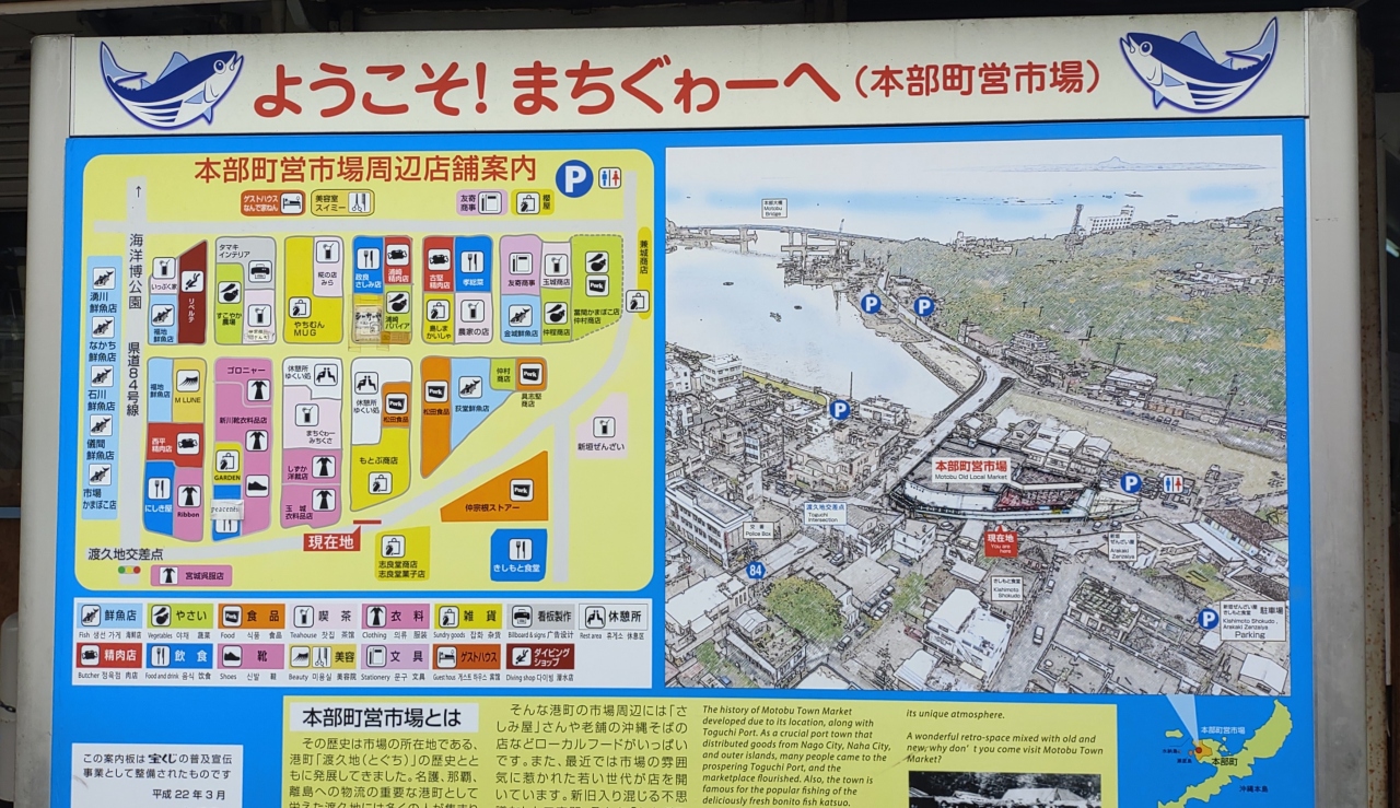 以前の旅行で前まで行ったが中には入らなかったので、今回訪問。名護市内から市バスに乗車、渡久地バス停で下車。そのすぐ先に市場がありました。残念ながら中は半分程度は閉まっていて、比較的最近openした感じの店舗が、数店ほど営業していました。お昼と思いましたが飲食店はアイスクリーム屋さん程度。近くの有名そば屋さんは大行列なので諦め、アイスを買って「カツオベンチ」で休憩だけしました。