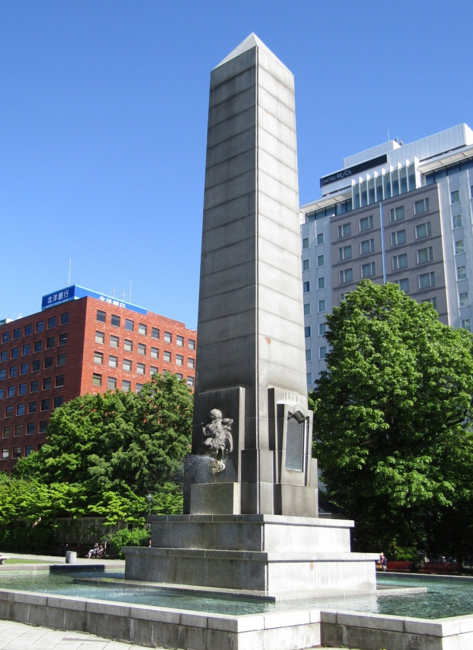 大通公園西5丁目の中心にあり、1936年に昭和天皇が行幸されたことを記念して建てられた聳え立つような塔です。