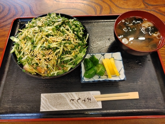 舞茸天丼とあずま丼で有名な食堂です.どちらにしようか迷いましたが,あずま丼を注文しました.出てきたのを見てびっくり.刻んだキュウリと小ネギに白ごまをかけた大盛のどんぶりが出てきました.よく見ると,キュウリの下には鮪の漬けが入っています.海のない群馬県でどうなのかなと思いましたが,思ったよりずっと美味しかったです.見た目のインパクトはスゴクあるので,インスタ映えを狙う方には特にお勧めです.