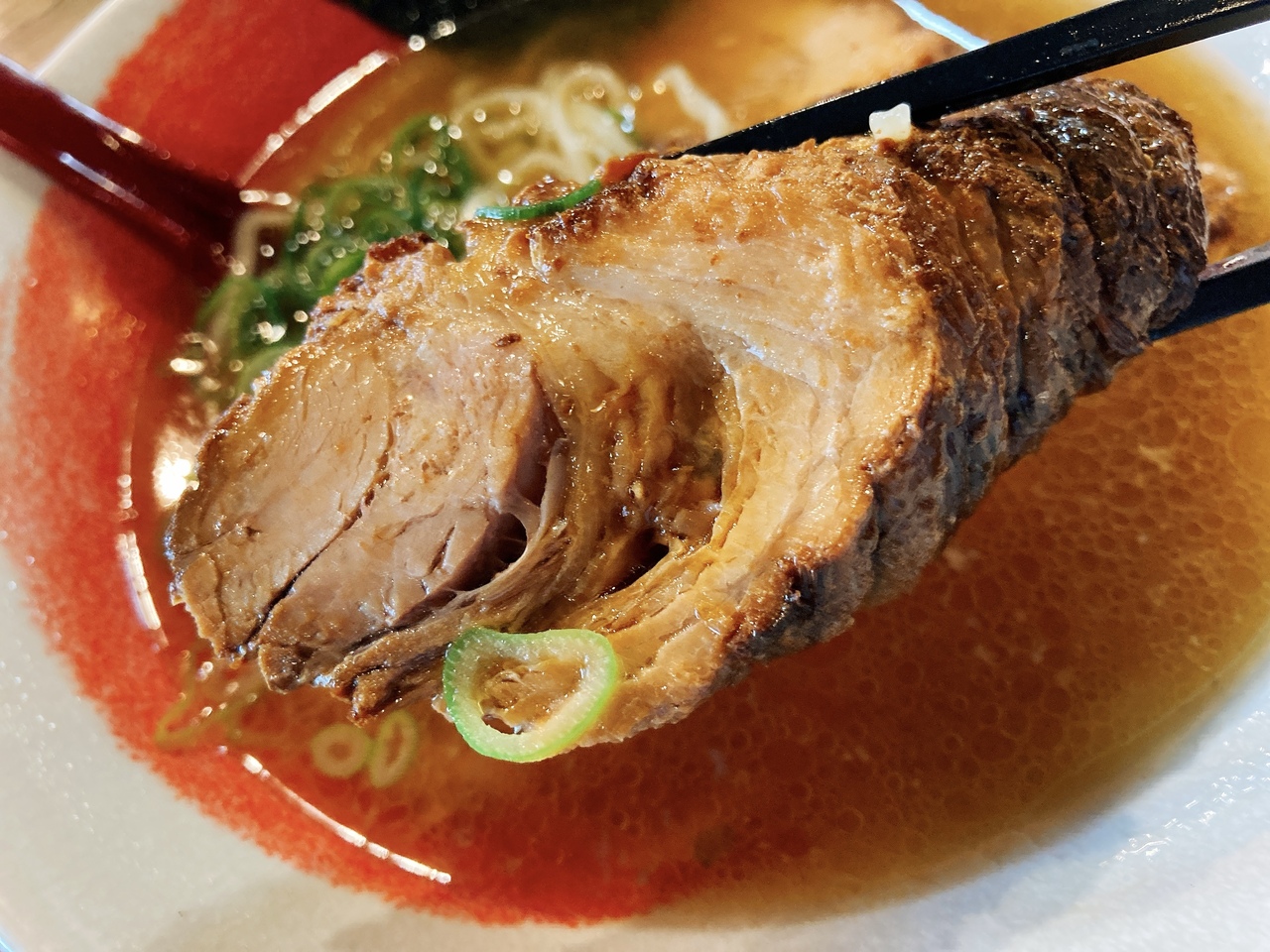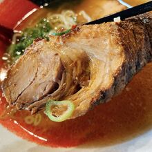 そしてチャーシュー。持ち上げてみるとズシリと重い。常滑チャーシューやばらよりは少し小さめ。脂身が少なくしっかりと噛みごたえのあるチャーシュー。良く煮詰まっていて美味い。