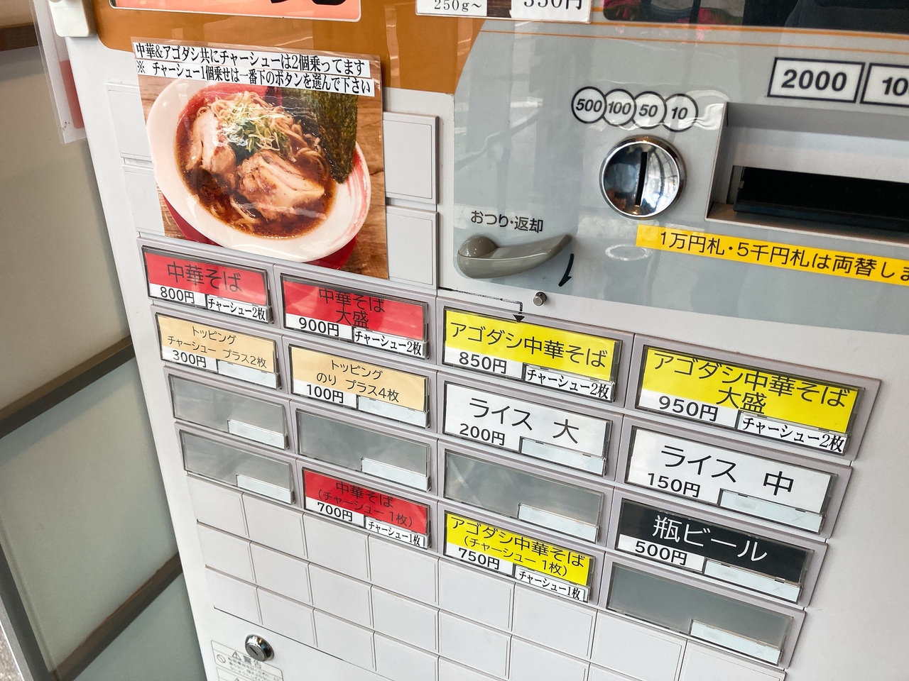 入り口の券売機でチケットを買う。ランチサービスなどはなく普通の中華そばとあごだし中華そばのいずれか。珍しいのであごだしにしてみた。チャーシュー2枚乗って850円。