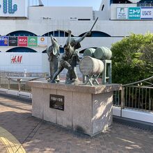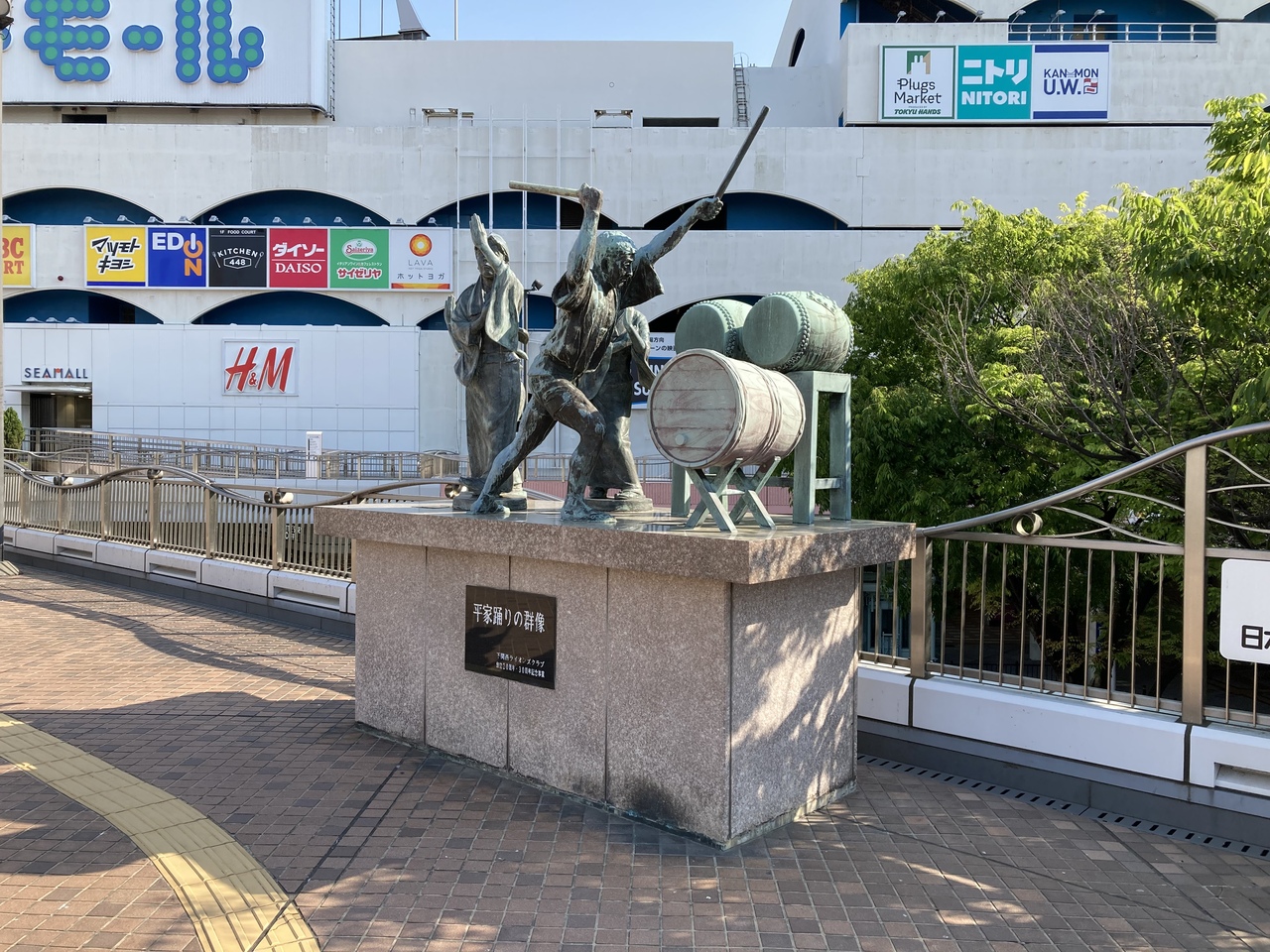 JR下関駅ペデストリアンデッキにある像。平家踊りは、京の都で権勢を誇った平家一門が源氏に追われ下関の壇之浦に辿り着き、戦いで敗れた供養の踊りが発祥とされる山口県の郷土芸能。1983年(昭和58年)、地元のライオンズクラブが創立20年を記念して建立したもの。実際には歌い手と三味線もいますが、踊り手と太鼓のみの像でも十分雰囲気が味わえます。